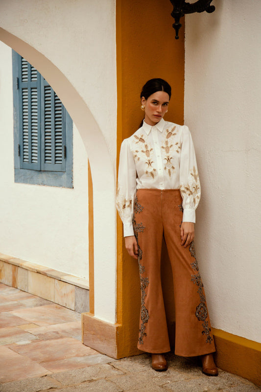 EsgotadoCALÇA BORDADA NOBU MARROM