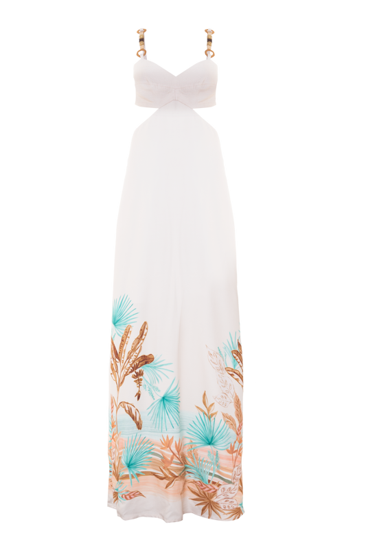 VESTIDO LONGO TROPICAL BANANEIRA BEGE