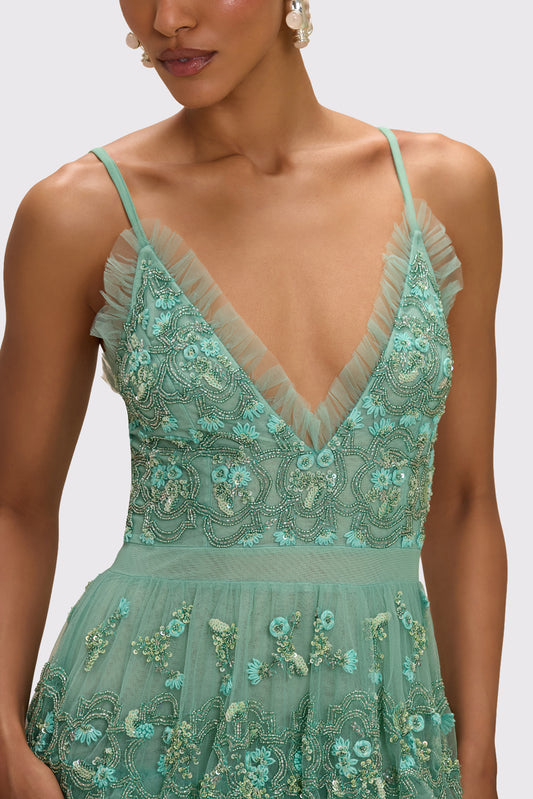 Cada elemento é pensado: desde um bordado posicionado com precisão até o forro que acompanha o movimento sem travar. A tridimensionalidade dos tecidos, o caimento pensado para gerar balanço e os acabamentos manuais entregam um resultado final que encanta em cada ângulo.