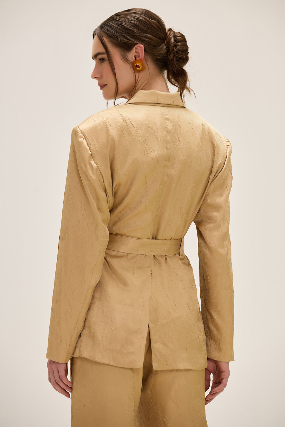 Confeccionado em cetim texturizado, este blazer apresenta acabamentos em viés que destacam a modelagem com delicadeza e precisão. Os dois bolsos frontais adicionam funcionalidade sem perder a sofisticação, enquanto os botões cobertos reforçam o acabamento impecável. A faixa para amarração na cintura permite ajustar a silhueta, criando um visual elegante e contemporâneo.