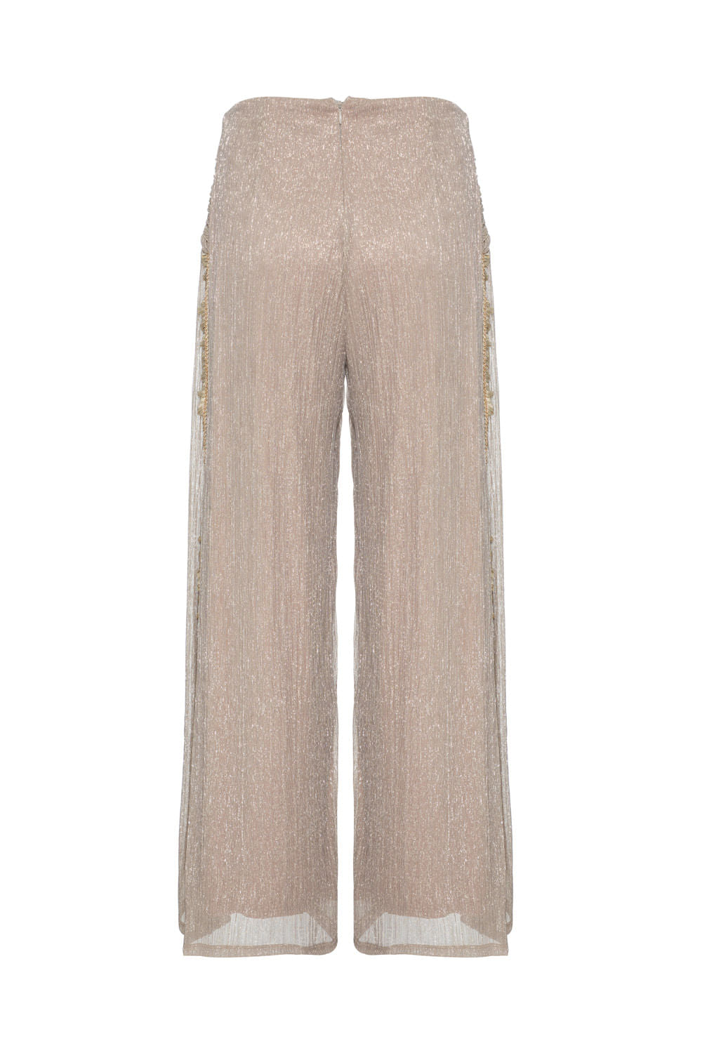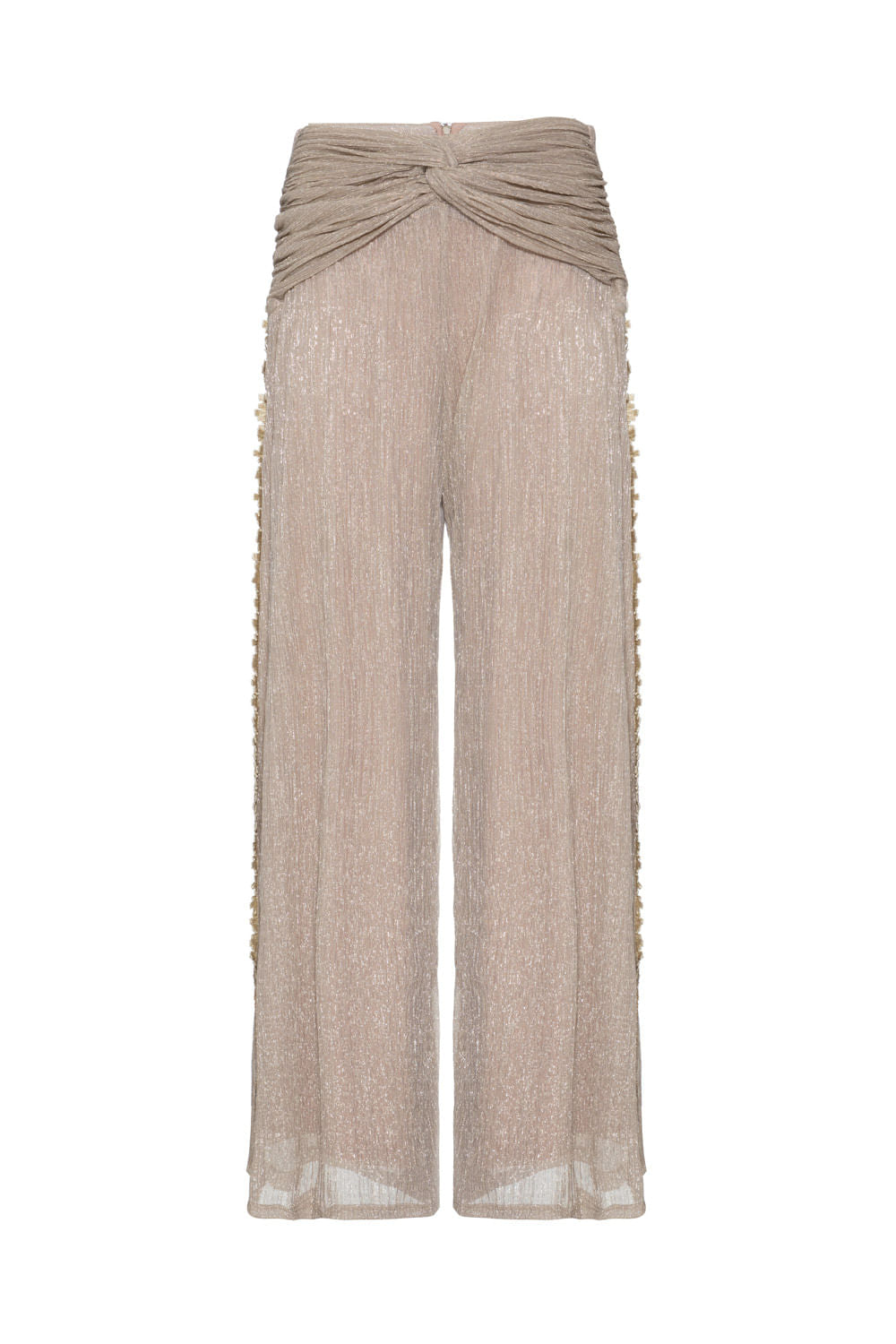 Calça ampla em lurex com aplicação de entremeios, pala com nó na cintura, franzido nas laterais do quadril, zíper invisível no centro costas e forro interno.