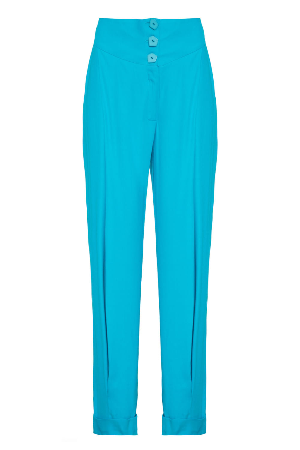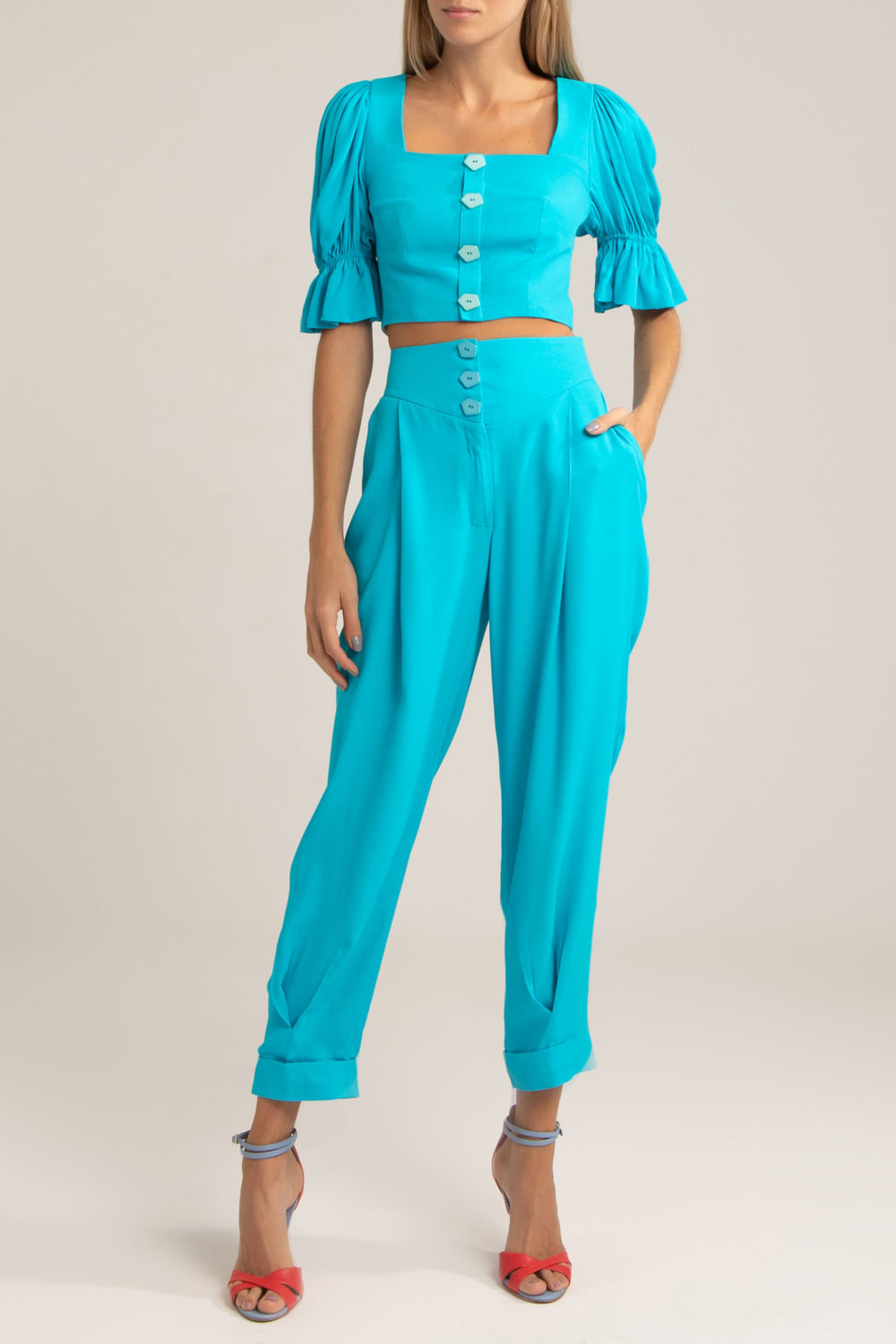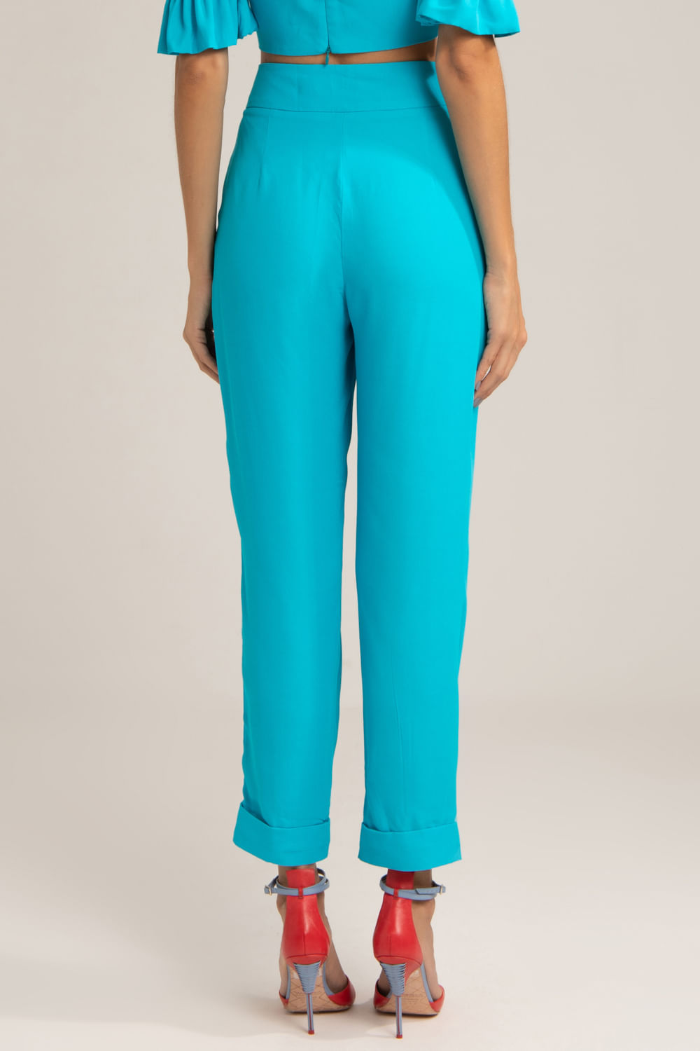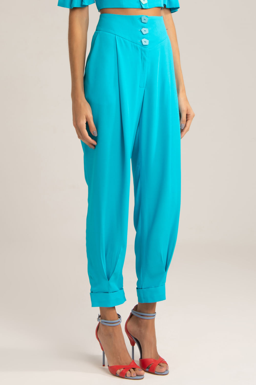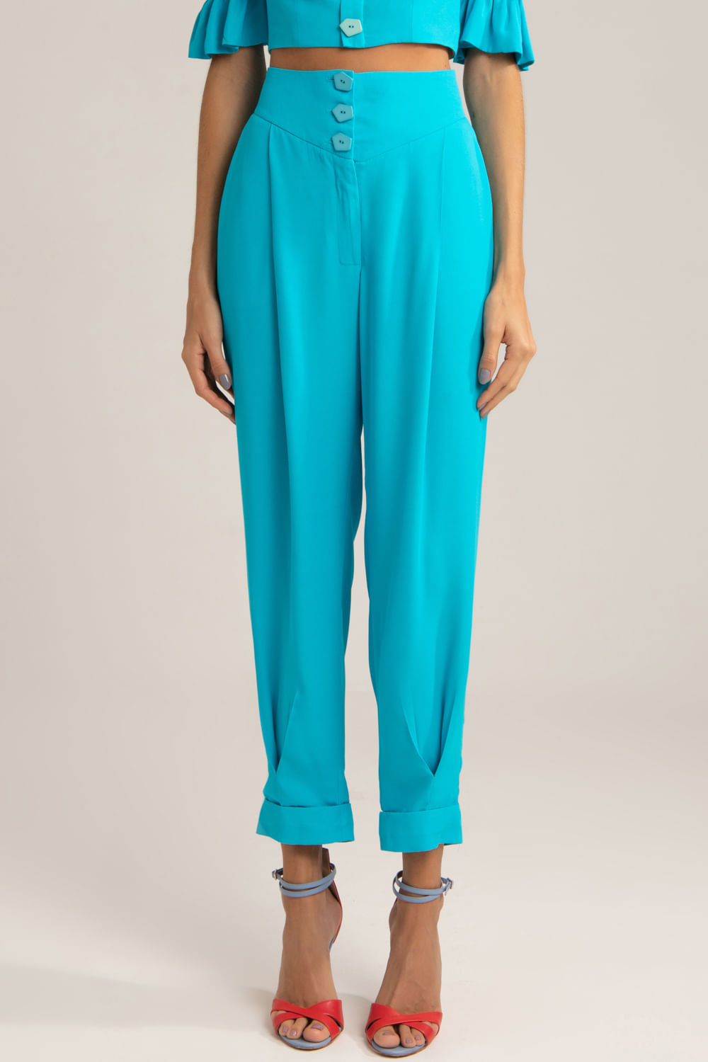 Calça com cós duplo, três botões no centro frente, dois bolsos laterais, uma prega frontal em cada perna, zíper e vista dupla.