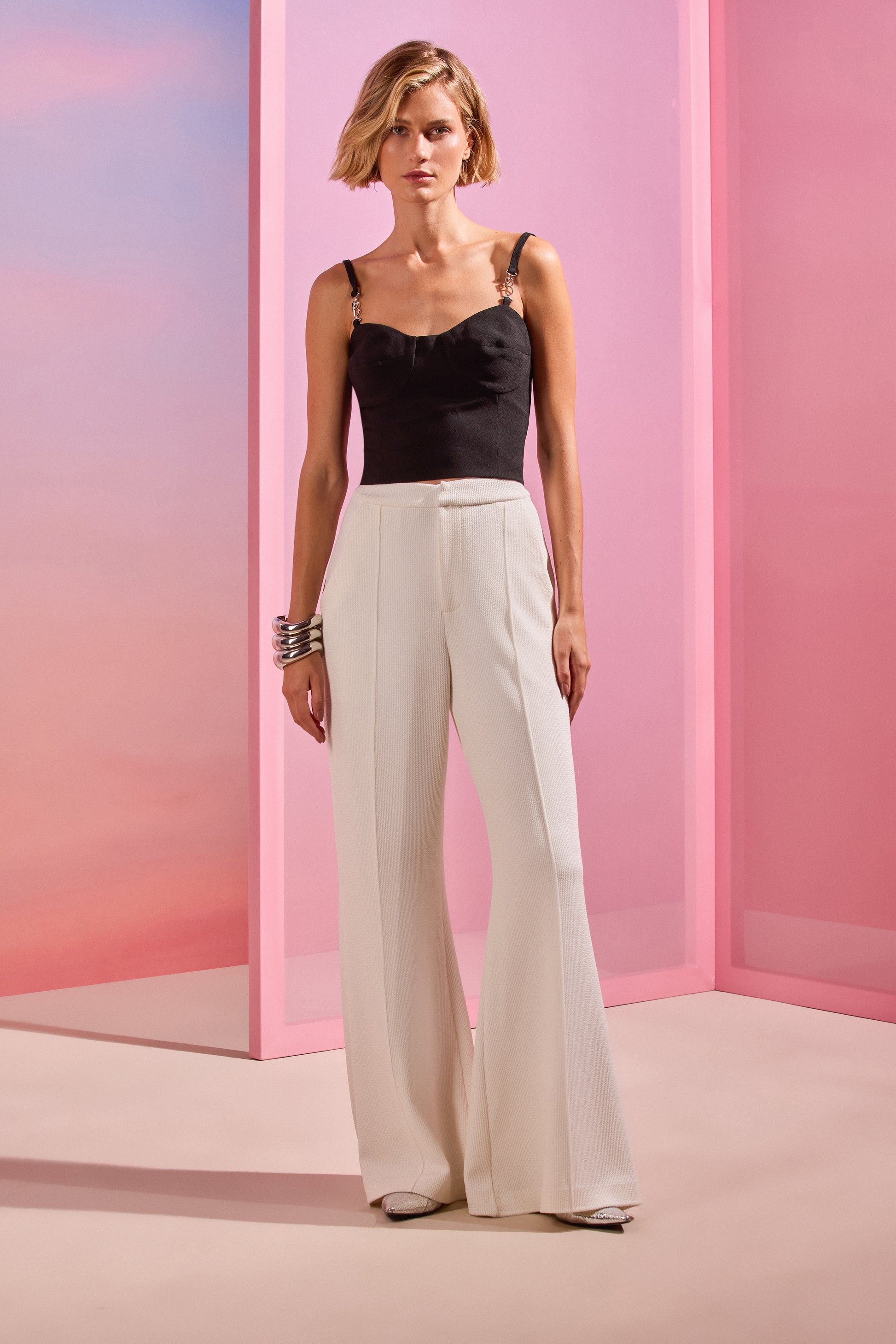 Calça confeccionada em malha, com caimento ajustado e perna ampla, possui bolsos e nervura no centro. Finalizada com gancho e zíper na frente. Para ir do trabalho ao look fashionista da noite.