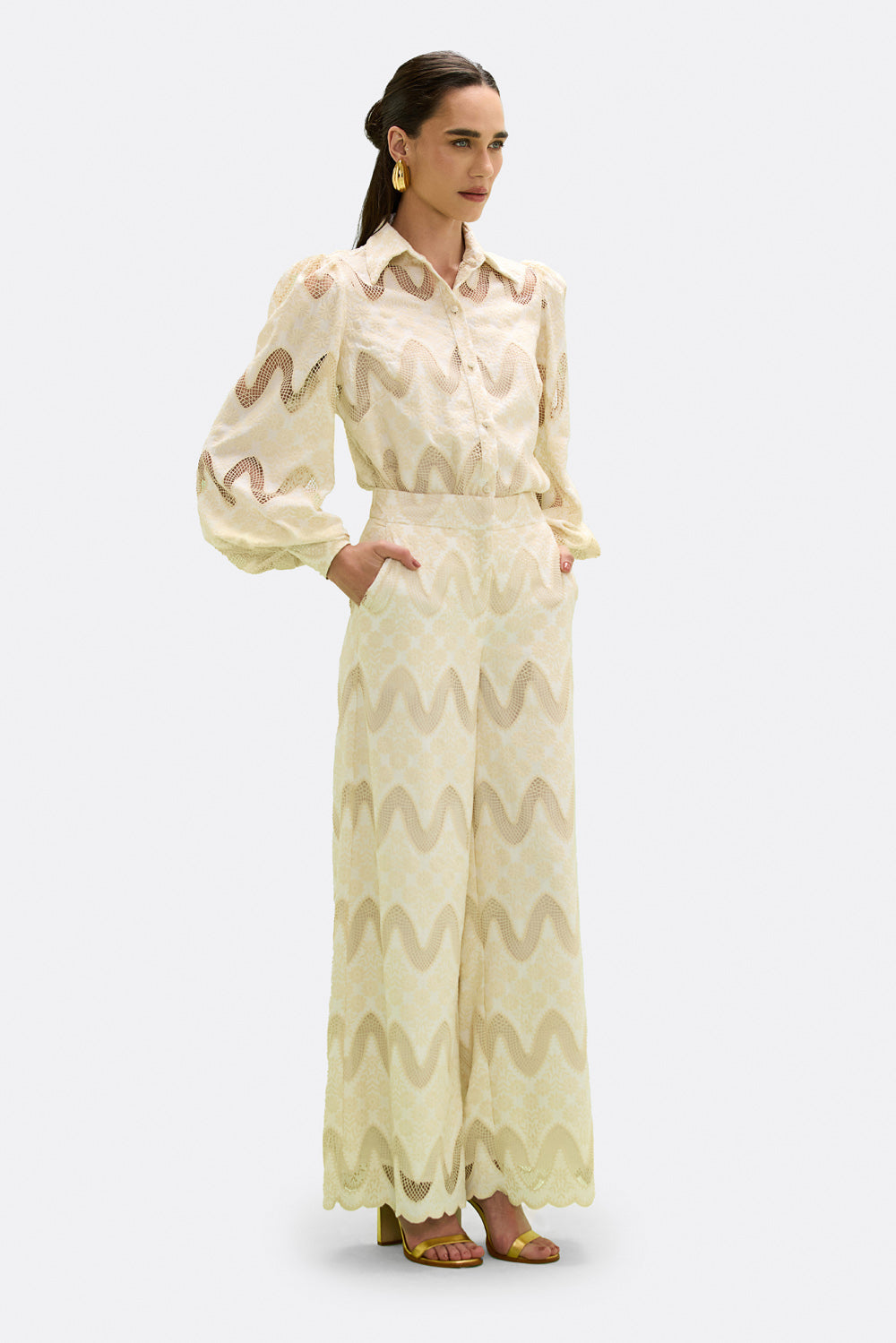 Calça confeccionada em laise flora, possui caimento amplo, bolsos nas laterais e fechamento com gancho. Uma peça perfeita para combinar com camisas ou tees, elevando o look casual a um outro patamar de sofisticação.