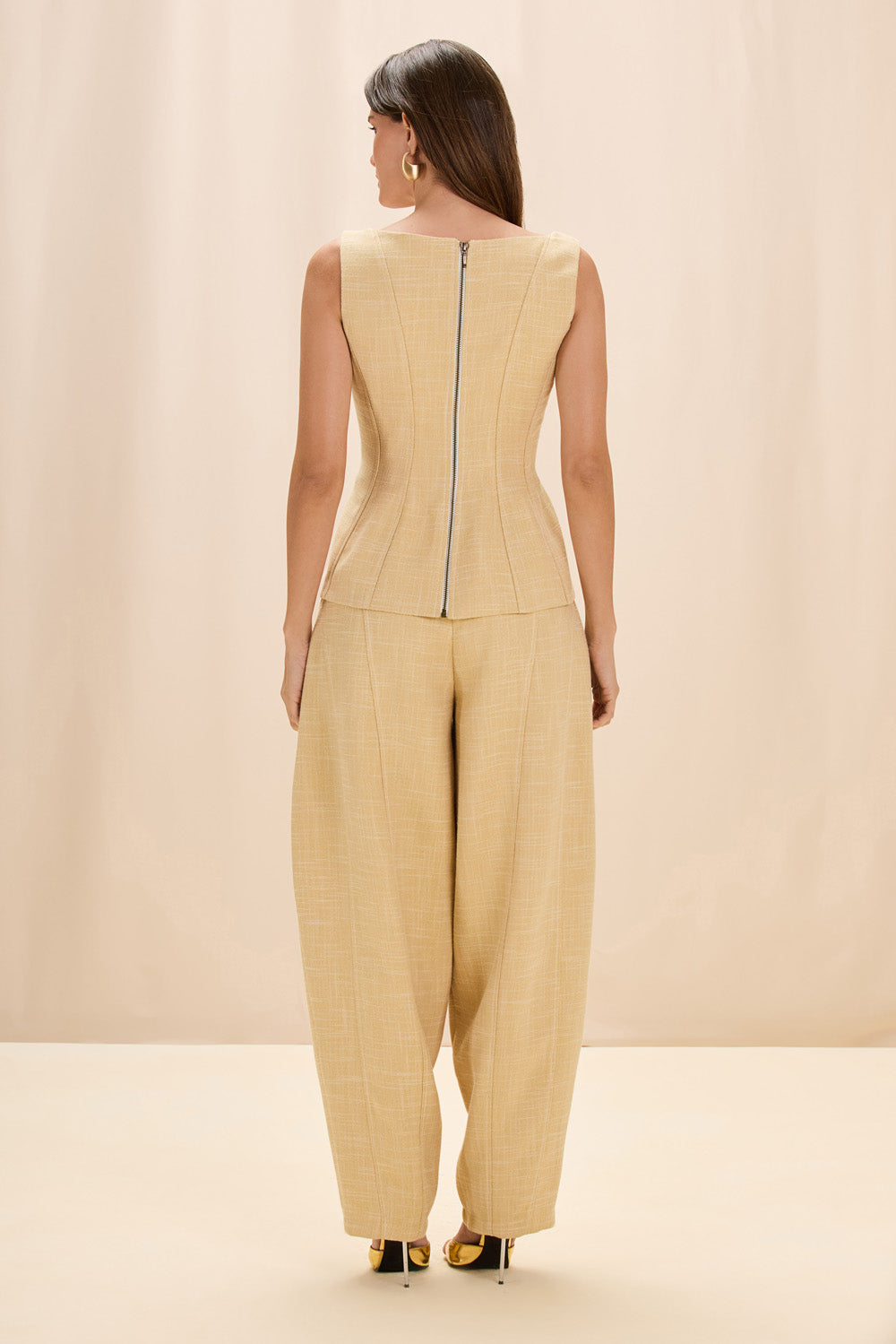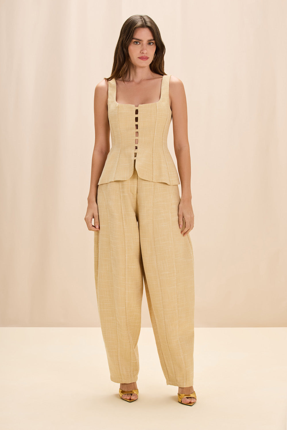 Confeccionada em linho rústico, esta calça apresenta modelagem nesgada que valoriza o caimento e cria um leve volume nas laterais, trazendo movimento e sofisticação à silhueta. O fechamento com zíper comum garante praticidade e acabamento limpo.