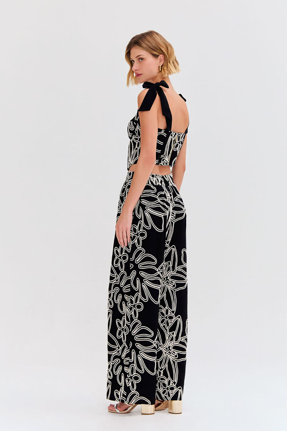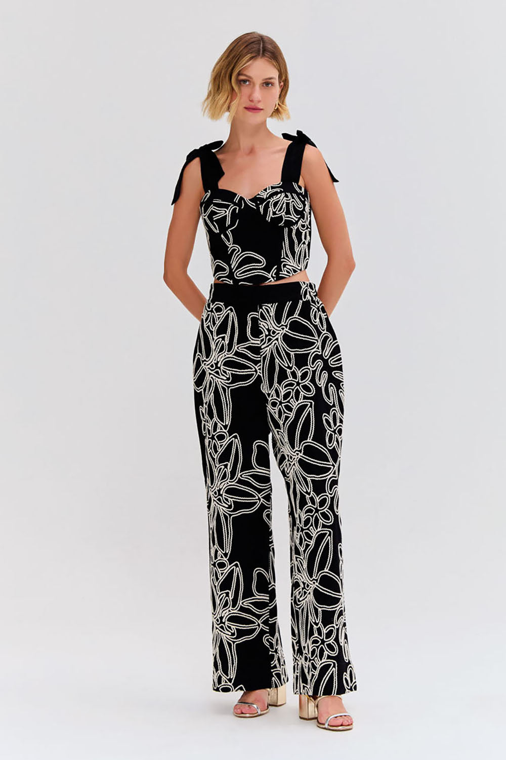Calça em viscolinho bordado sem forro, possui cós de elástico e bolsos faca.