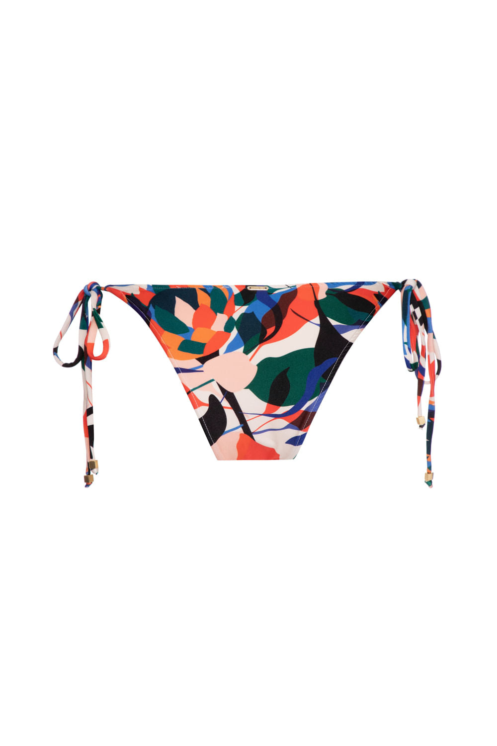 Calcinha de biquíni com amarração lateral, ponteiras douradas e forro interno.