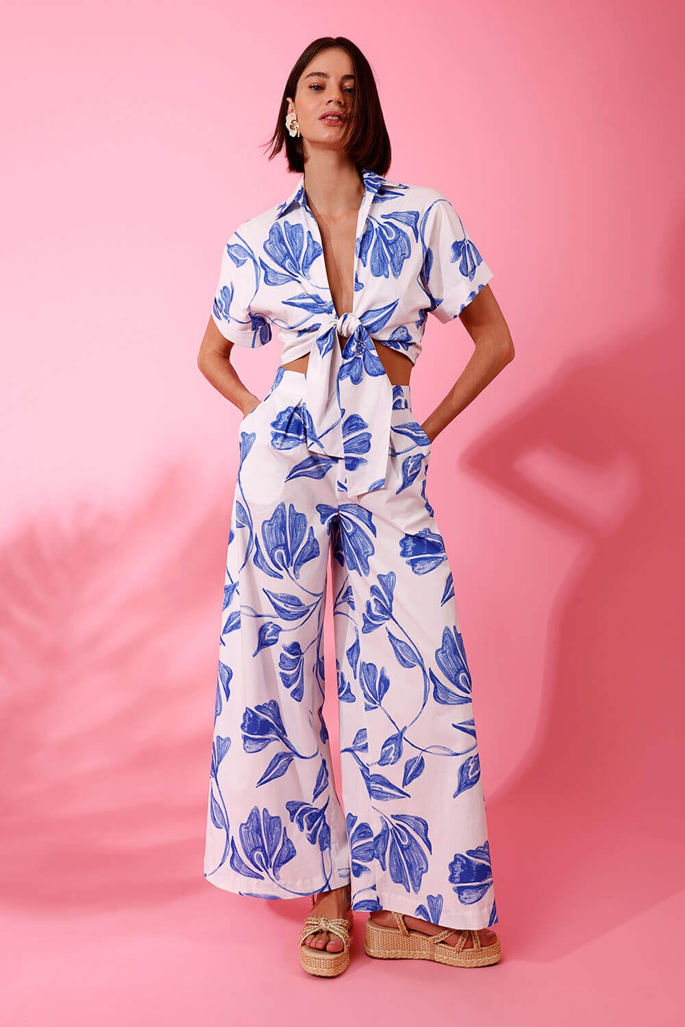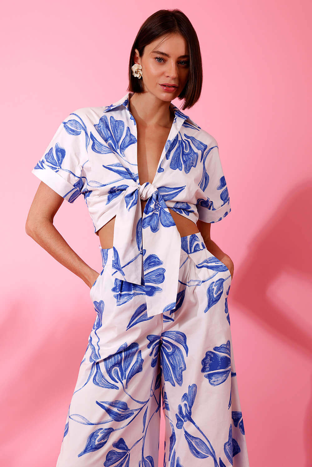 Camiisa estampada confeccionada em tricoline, possui amarração no centro frente, gola dupla e prega na parte posterior,