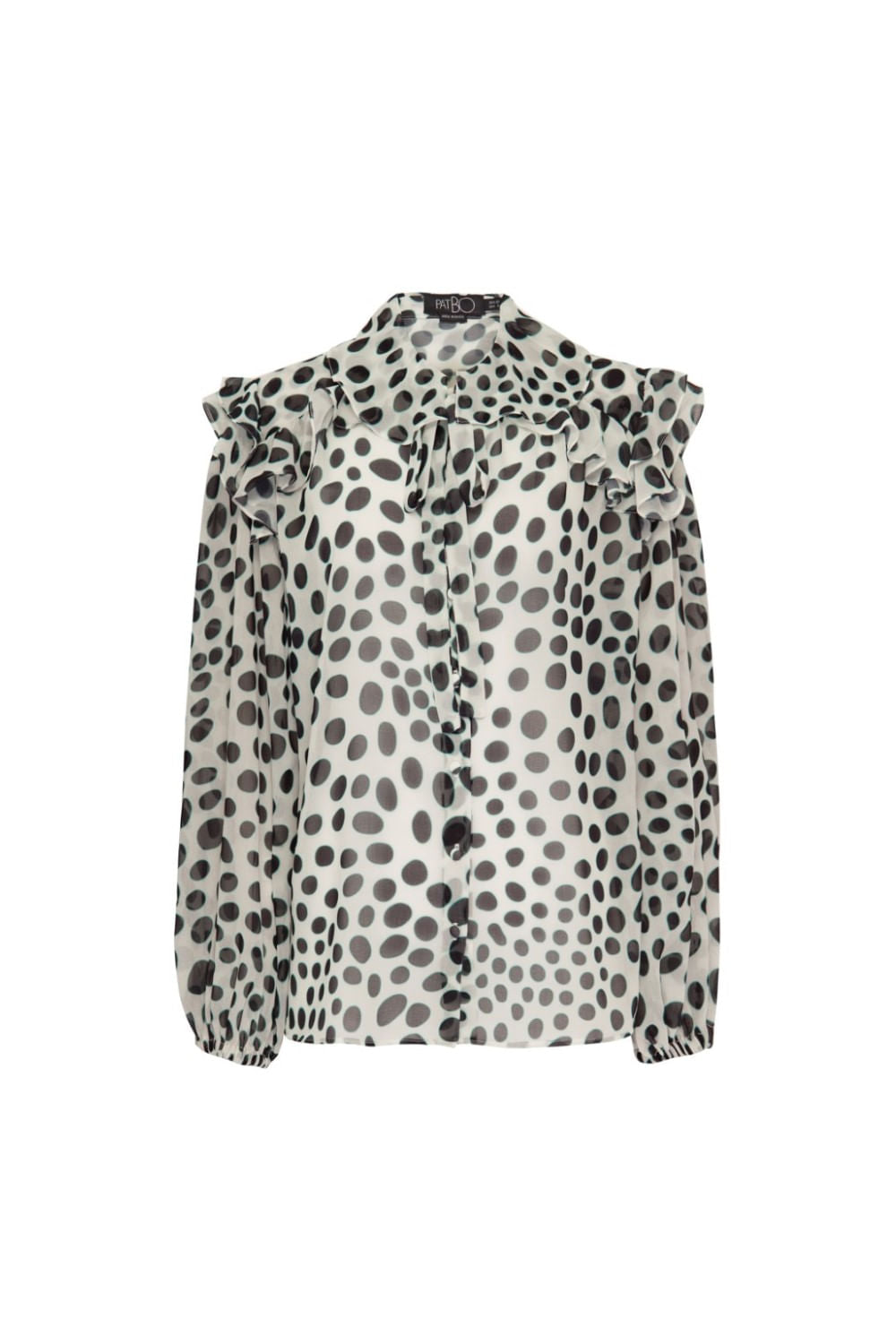 Camisa estampada com babados na gola e nos ombros, duas faixas duplas para marração no pescoço, punhoscom elástico e botões encapados no centro frente.