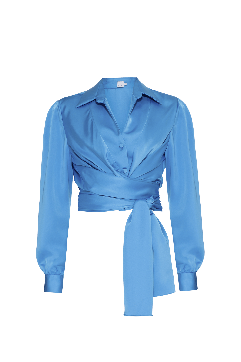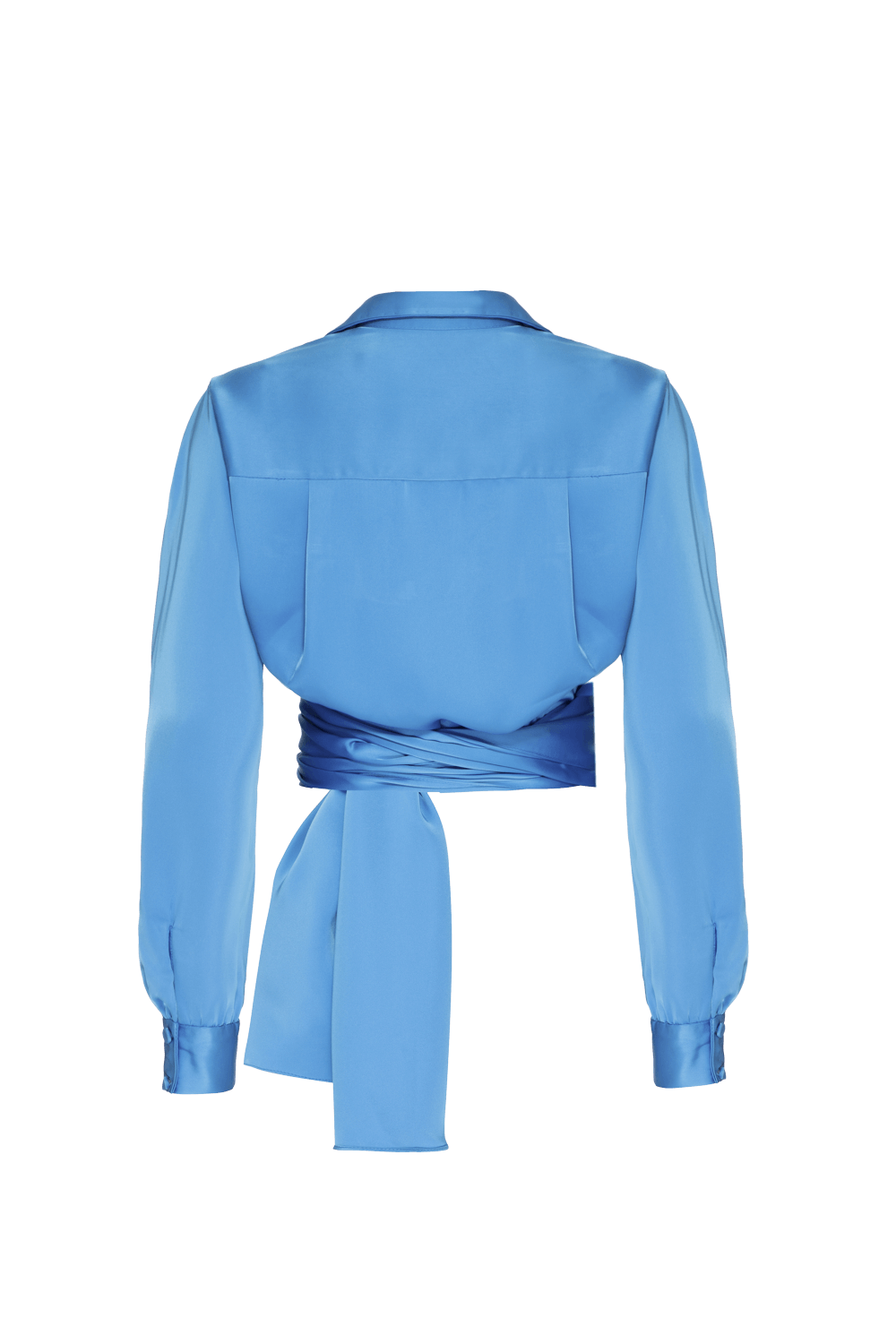 Camisa transpassada confeccionada em cetim, possui amarração na cintura, mangas longas, gola dupla, botões encapados no centro frente e punhos.
