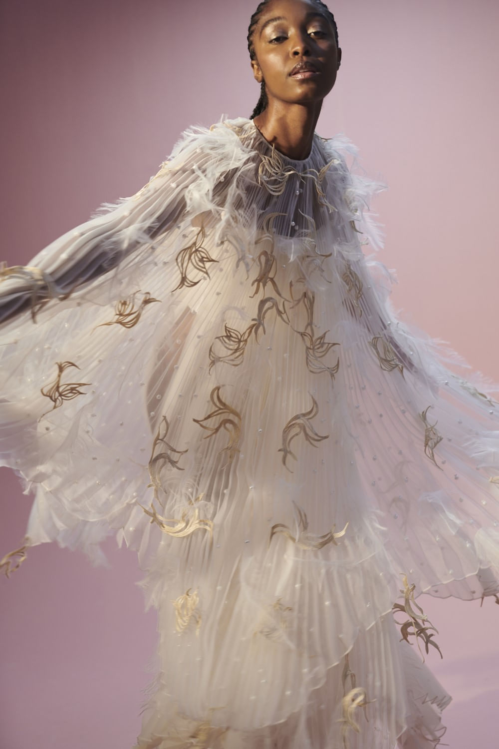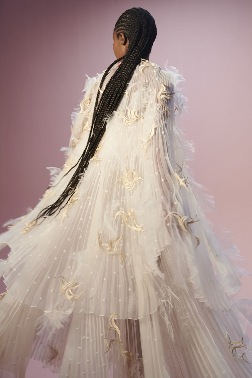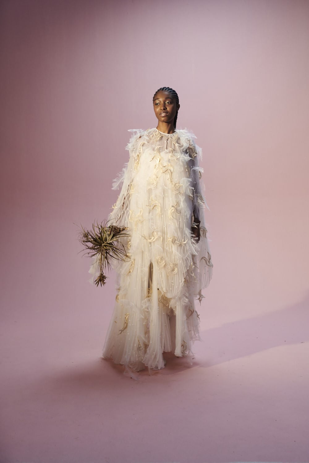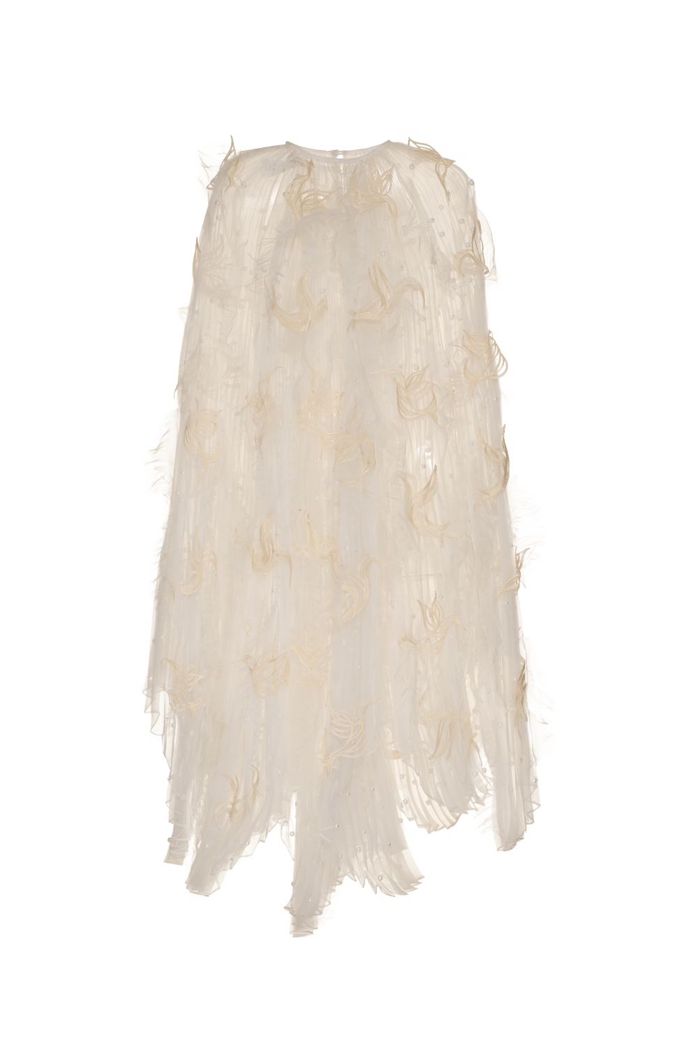Capa plissada confeccionada em organza com transparência, possui bordado aplicado e barra assimétrica. Não acompanha o vestido, vendido separadamente.