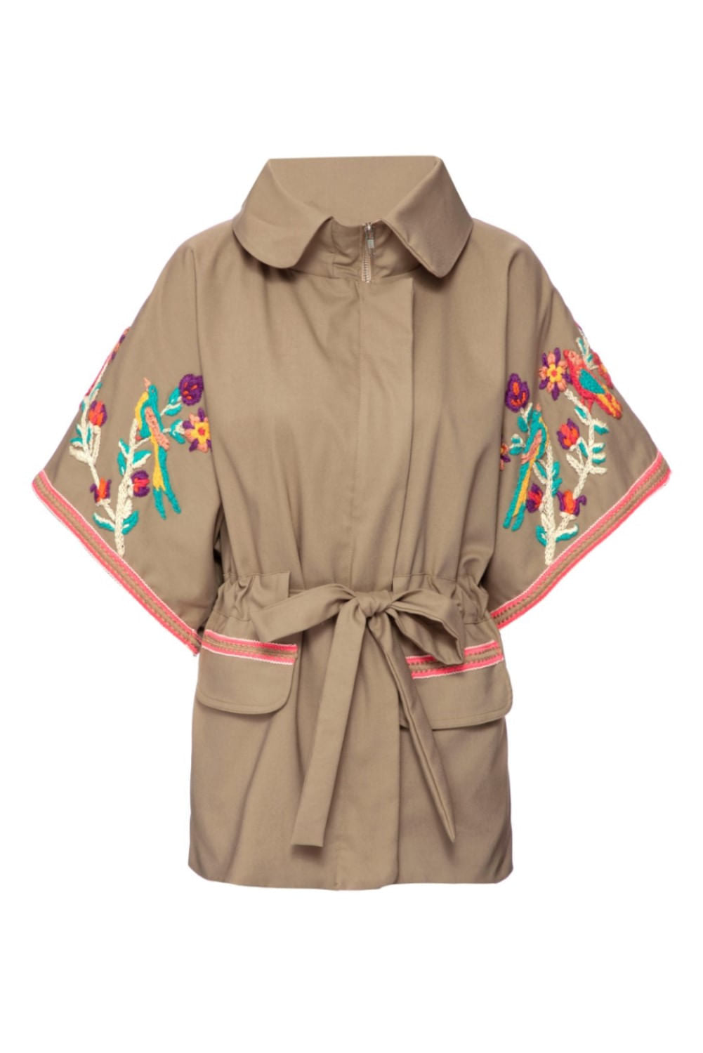 Casaco amplo com bordado nas mangas, gola e vista duplas, faixa para amarração na cintura, canaleta no cós para a passagem da faixa e aplicação de entremeio bordado na pala dos bolsos e na extremidade das mangas.