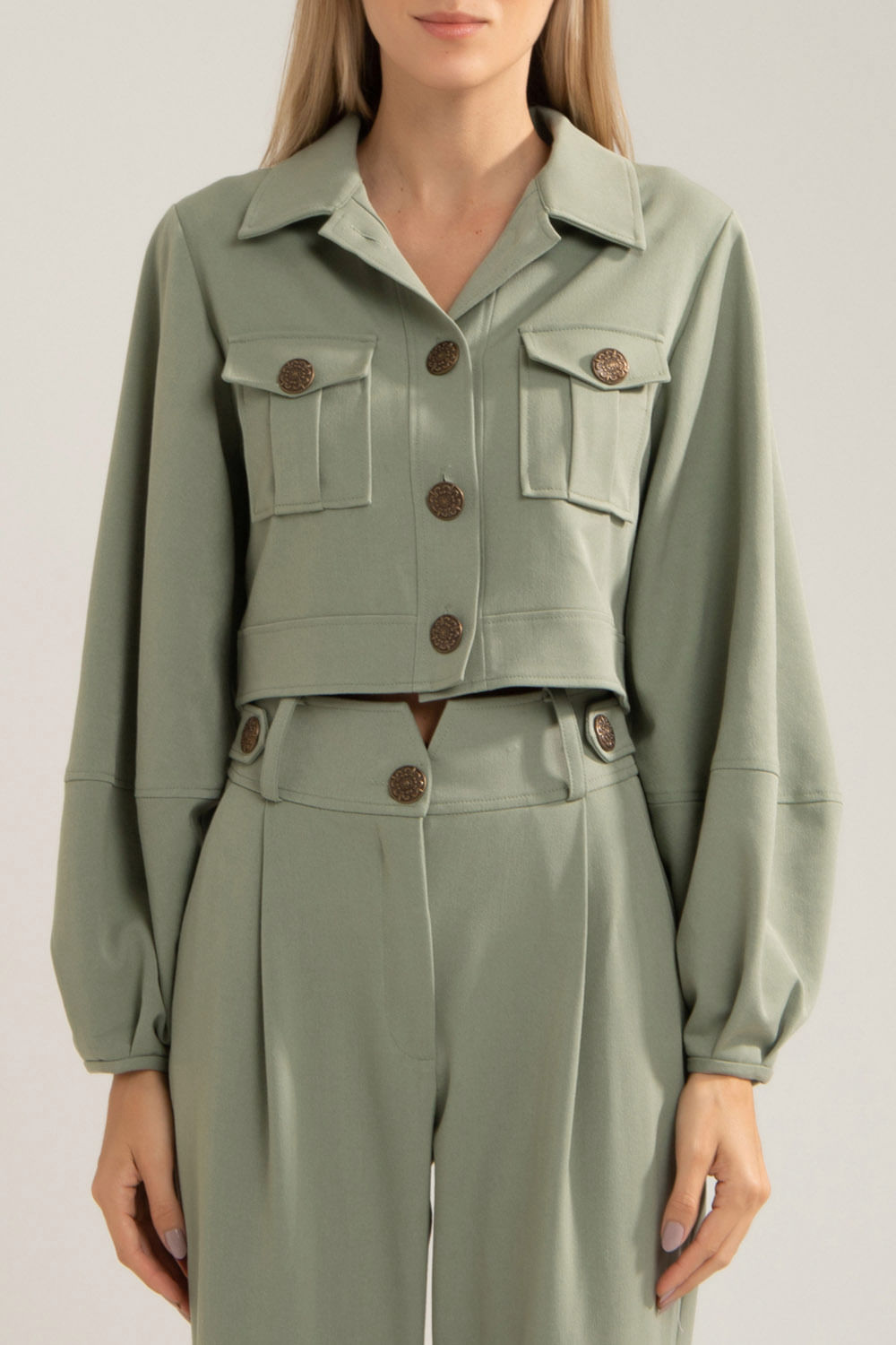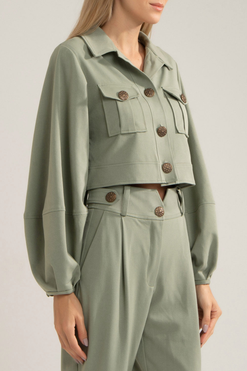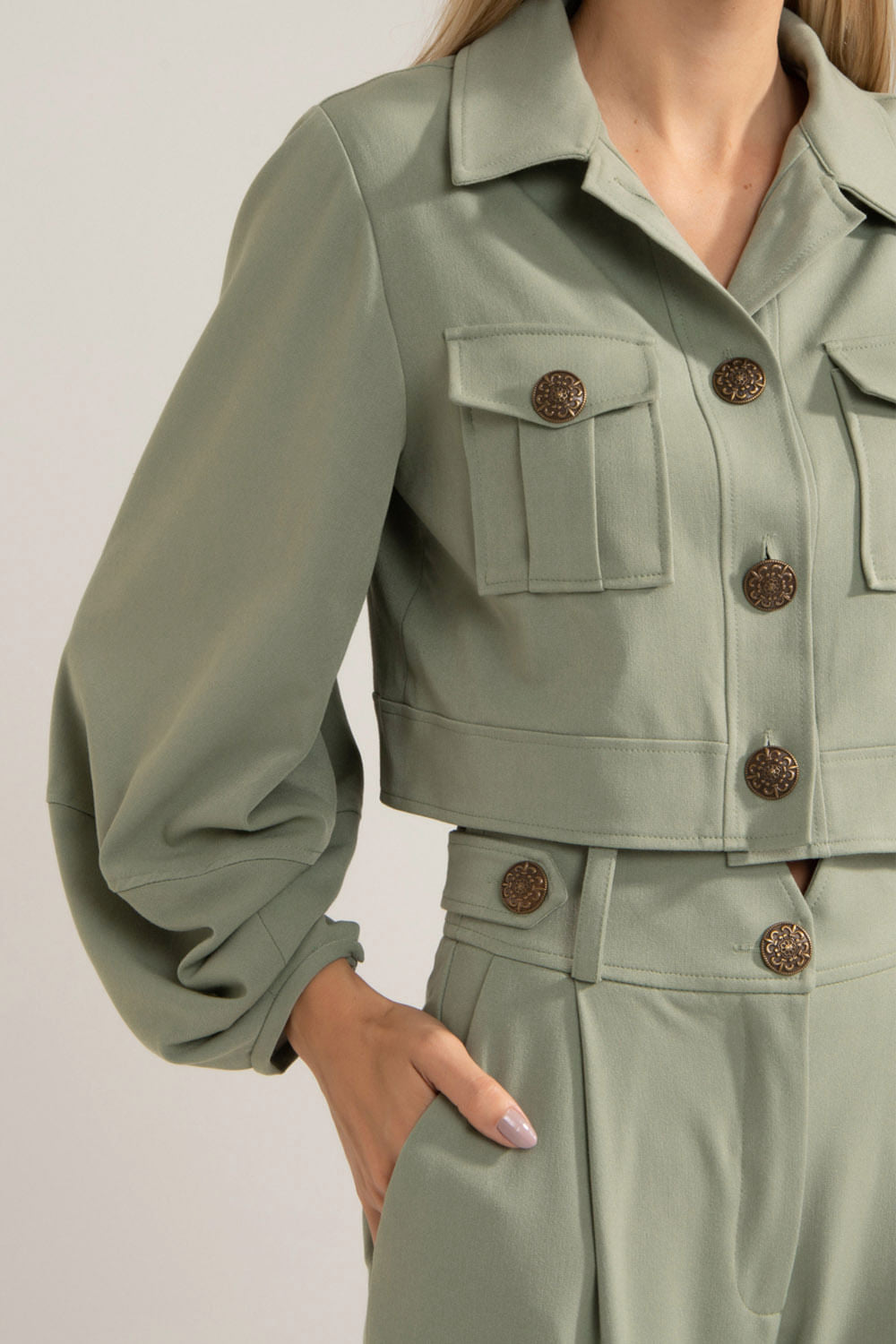 Casaco curto com gola dupla (2 camadas de tecido) quatro botões trabalhados no centro do busto, dois bolsos com botões na frente. mangas volumosas, barra larga com uma prega no centro das costas.