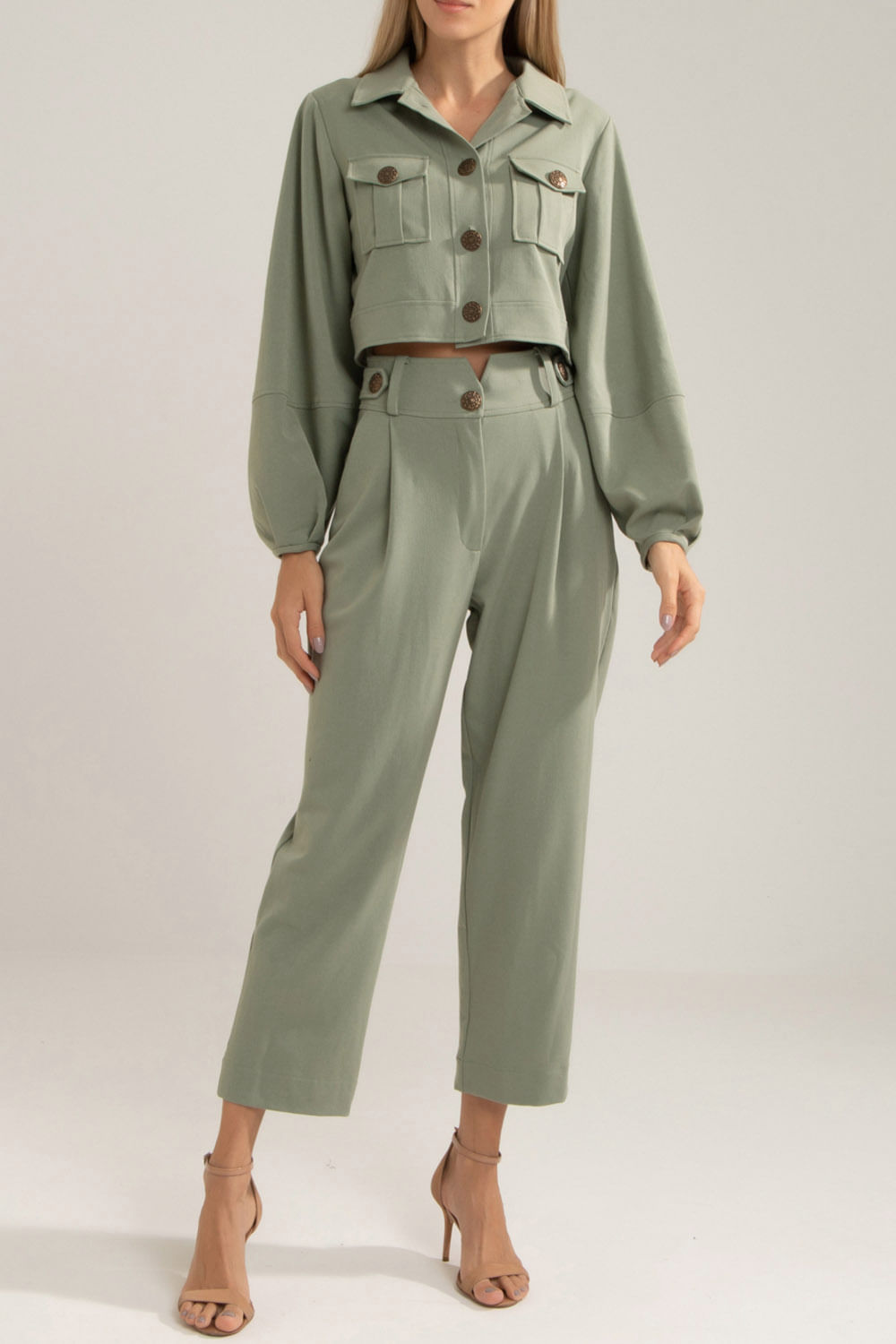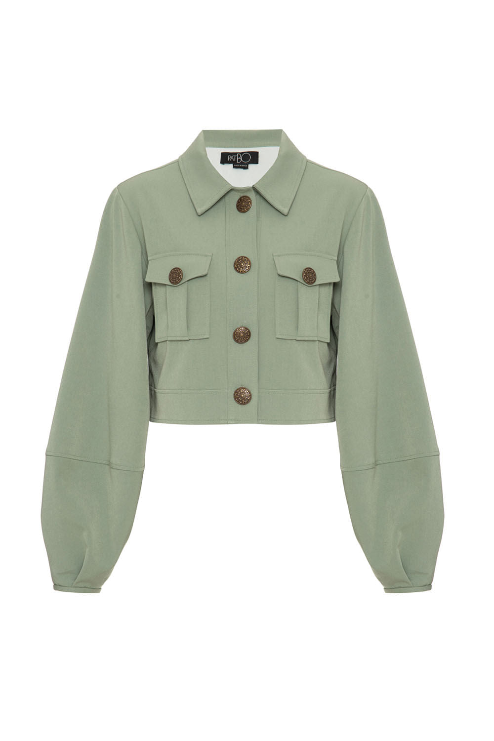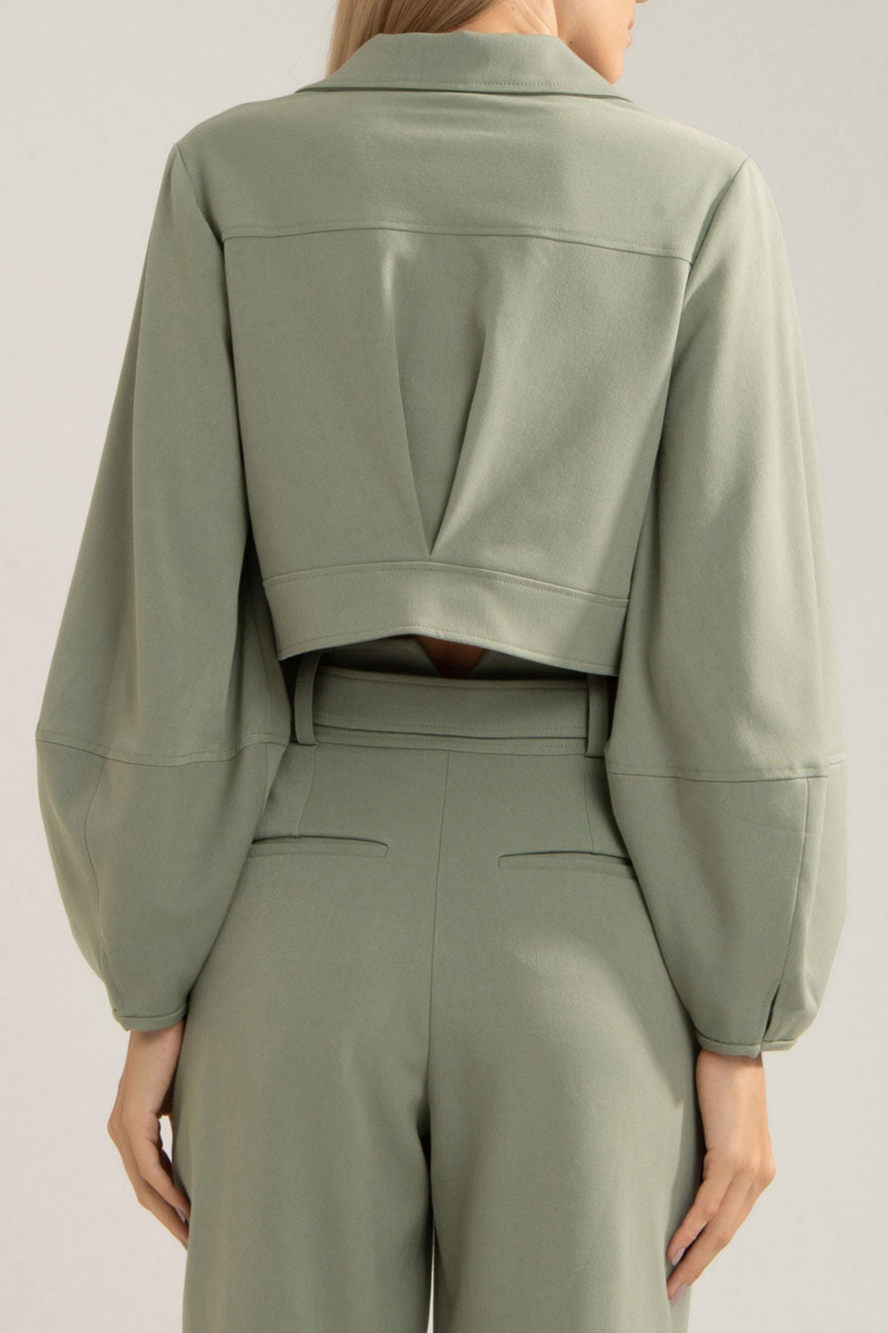 Casaco curto com gola dupla (2 camadas de tecido) quatro botões trabalhados no centro do busto, dois bolsos com botões na frente. mangas volumosas, barra larga com uma prega no centro das costas.
