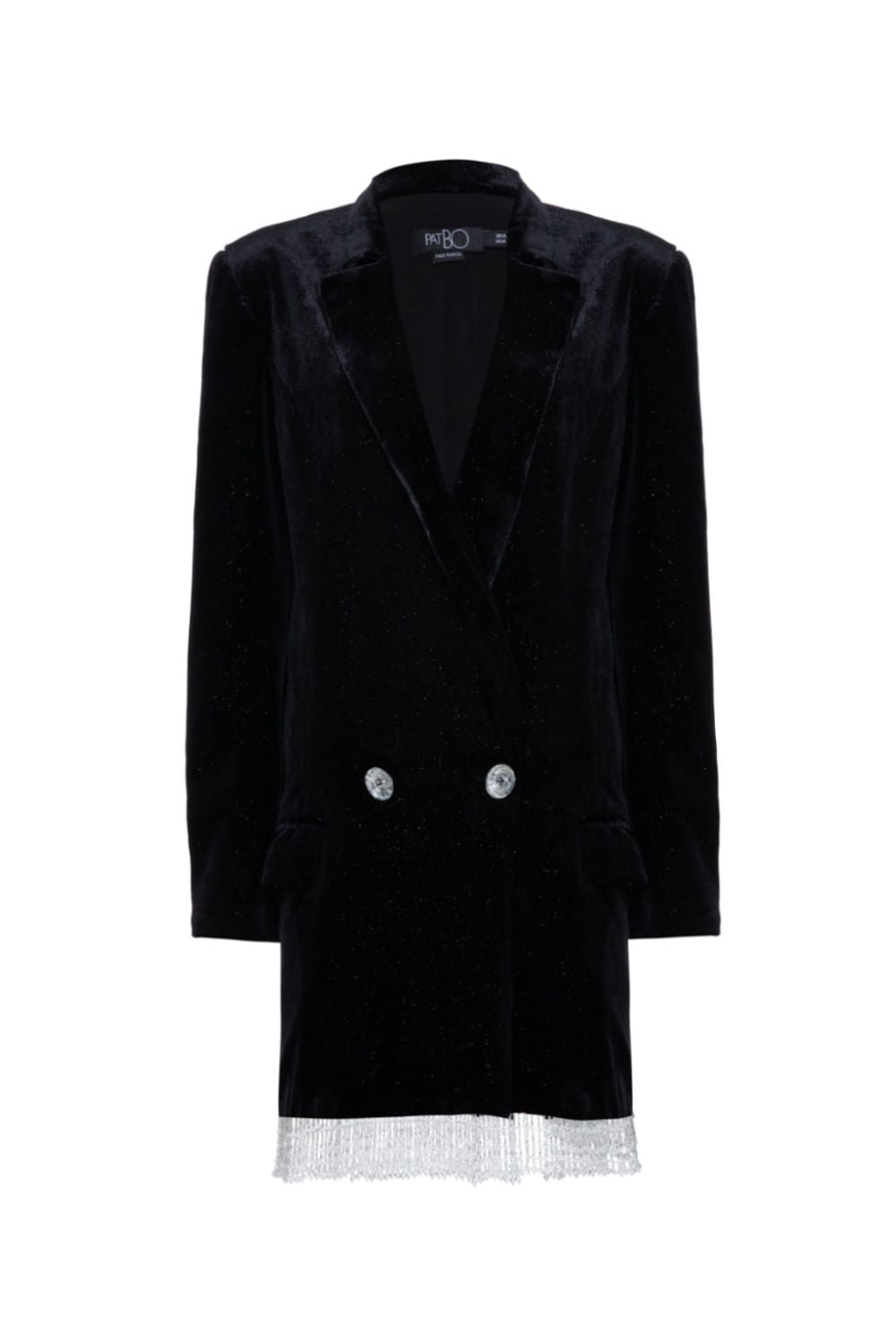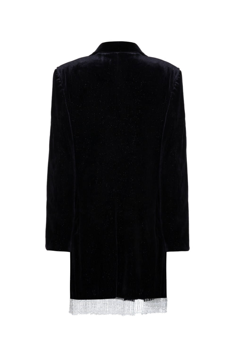 Casaco oversized com bolsos frontais, lapela alongada, dois botões trabalhados no centro frente, franjas de pedrarias na barra e forro interno.
