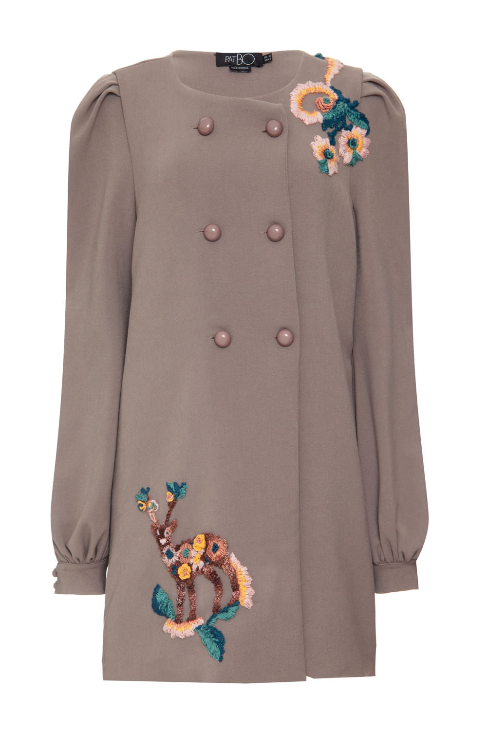 Casaco longo bordado com mangas longas bufantes com punhos.