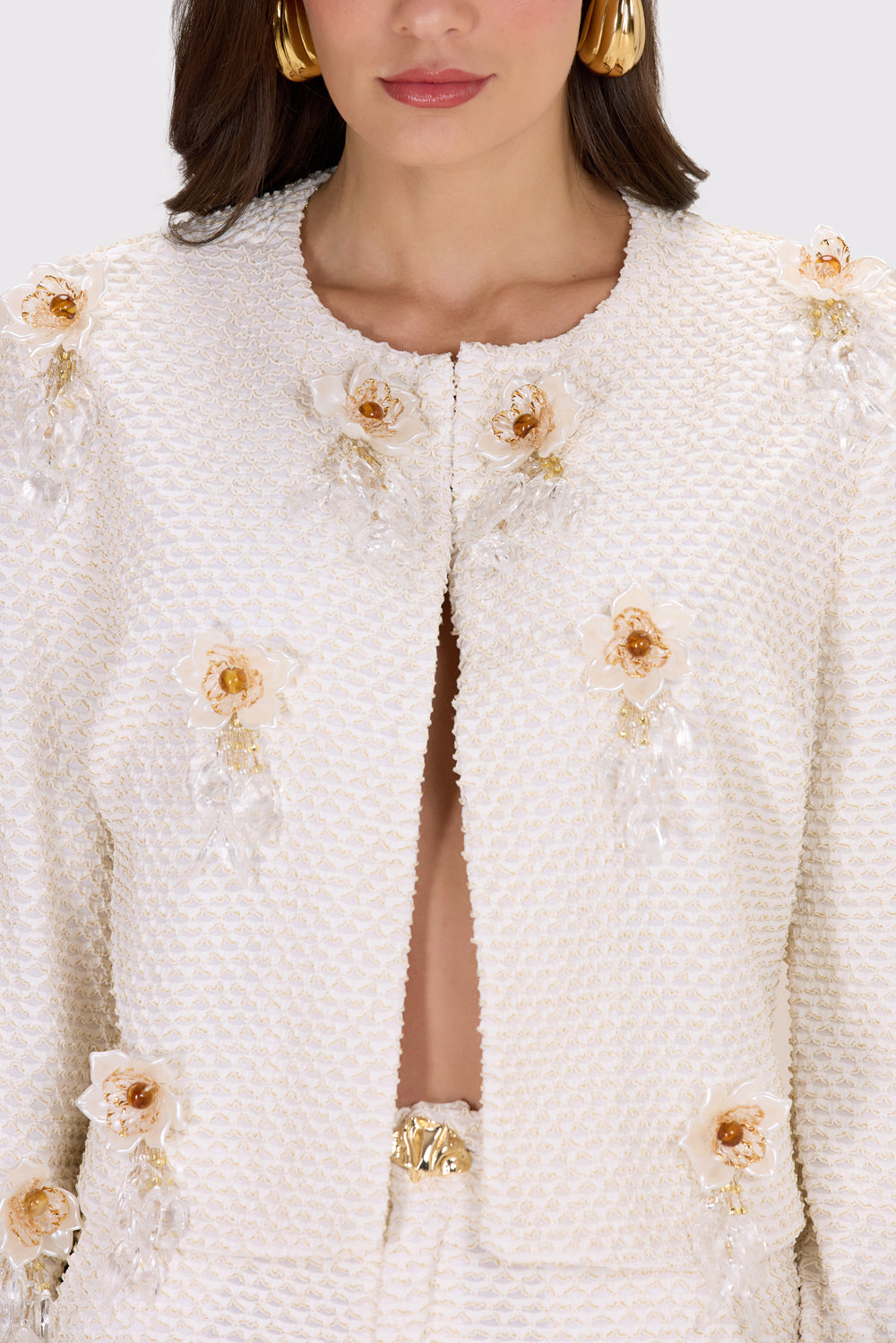 Clássico, com textura marcante e um toque de brilho sofisticado, este casaqueto é uma peça que eleva instantaneamente qualquer produção. Confeccionado em malha jacquard com lurex e forro interno, tem caimento de alfaiataria e mangas levemente evasês com fenda, um detalhe sutil que acrescenta bossa ao shape estruturado. O destaque fica por conta das flores brancas e douradas bordadas à mão, salpicadas ao longo da peça como joias delicadas sobre o tecido. O fechamento por gancho no decote garante um visual limpo e elegante. Use com a calça coordenada para um conjunto sofisticado que transita com facilidade do dia para a noite, combinando textura, brilho e um toque artesanal em perfeita harmonia.