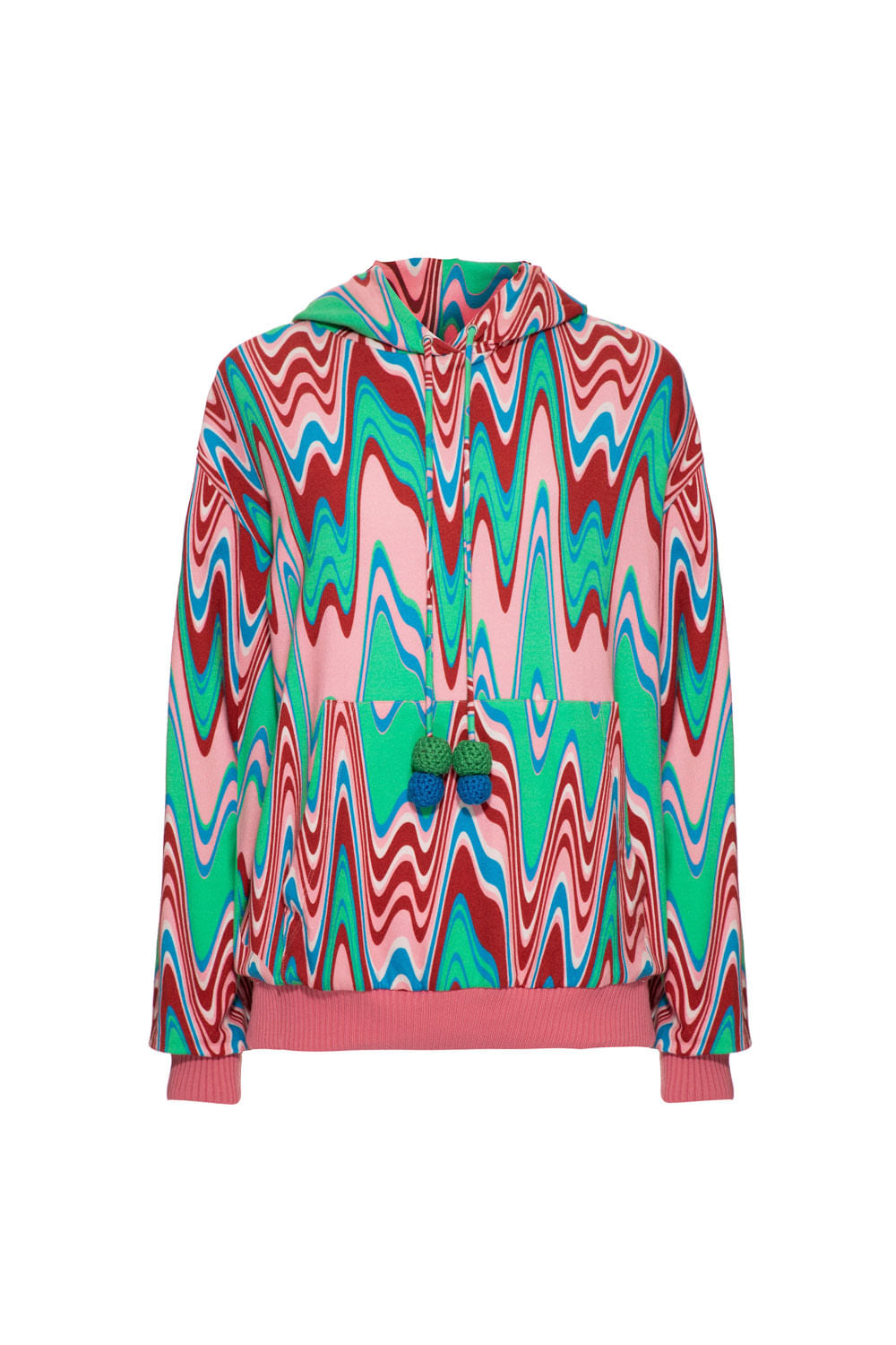 Moletom estampado com capuz, ribanas nos punhos e barra, bolso canguru no centro frente e cordões com ponteiras em crochê.