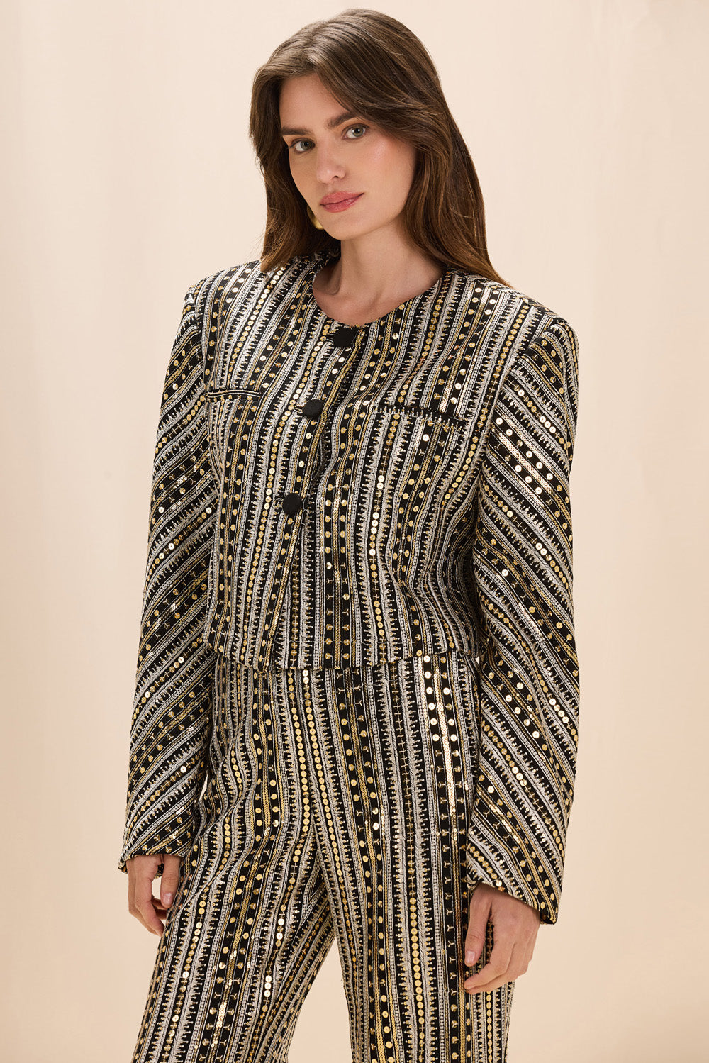 Confeccionado em tecido bordado, este casco curto combina estrutura e delicadeza em uma proposta sofisticada. O trabalho minucioso do bordado confere textura e profundidade ao visual, enquanto os botões cobertos garantem um acabamento limpo e refinado.