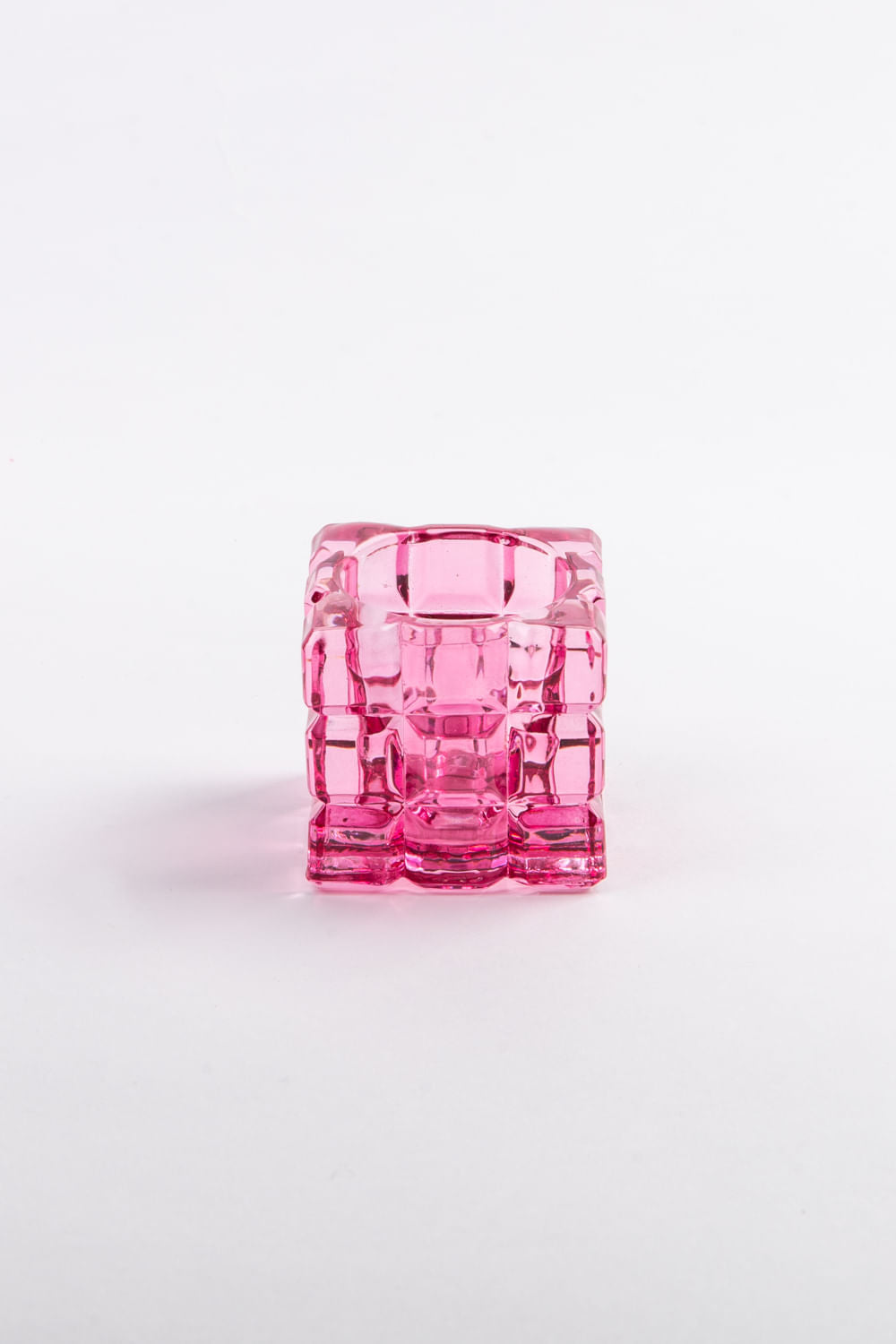 Castiçal de vidro em formato de cubo. Vidro resistente à altas temperaturas.