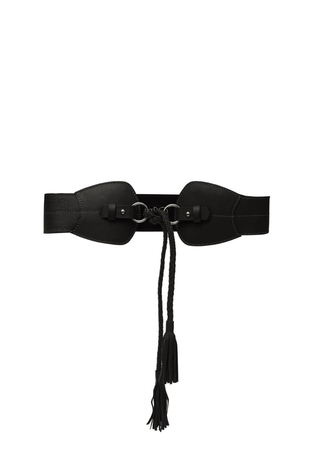 Cinto de couro com duas argolas de metal, extremidades mas largas que o corpo do cinto e duas cordões para amarração na frente.