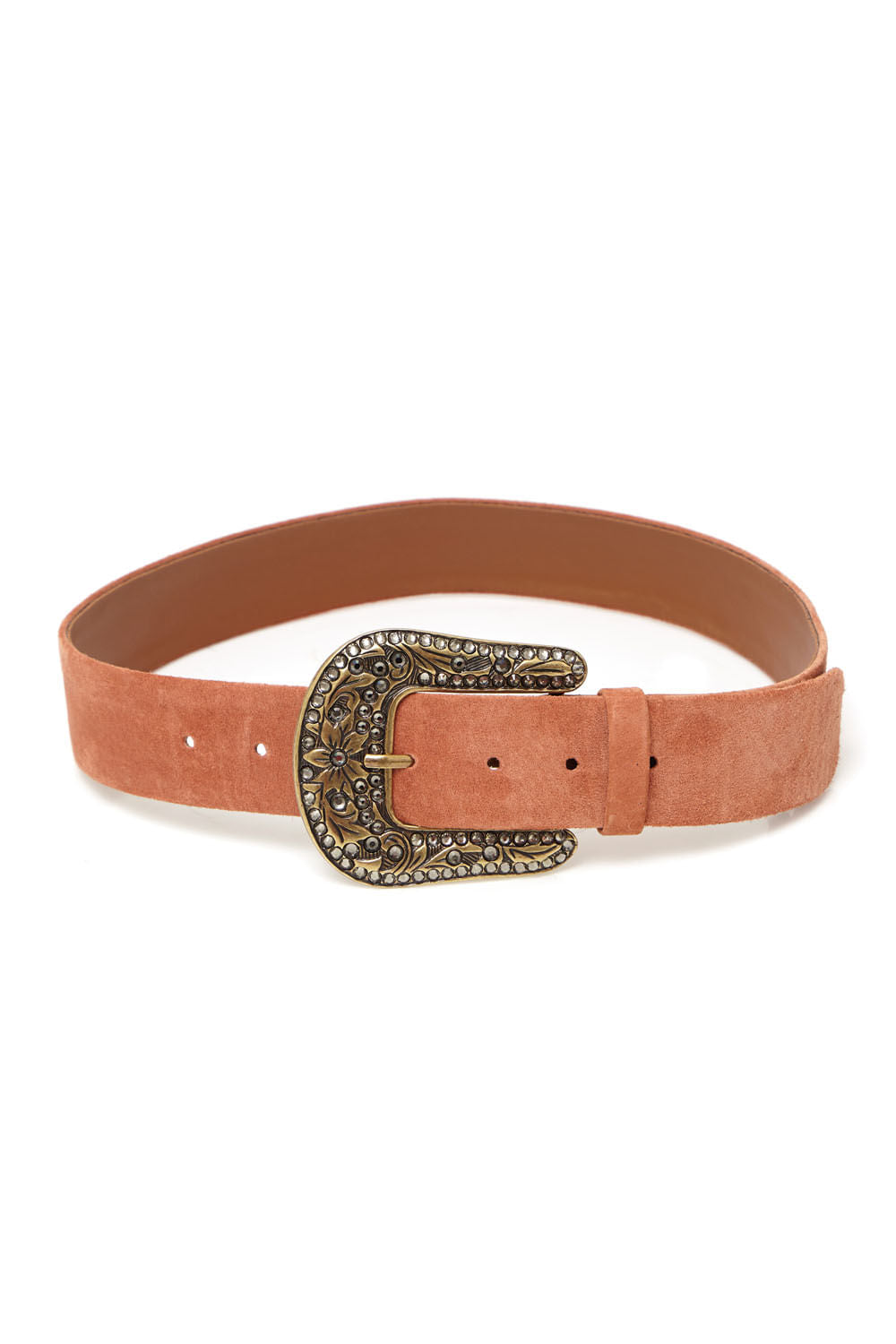 Cinto em couro camurçado com fivela grande em metal trabalhado.