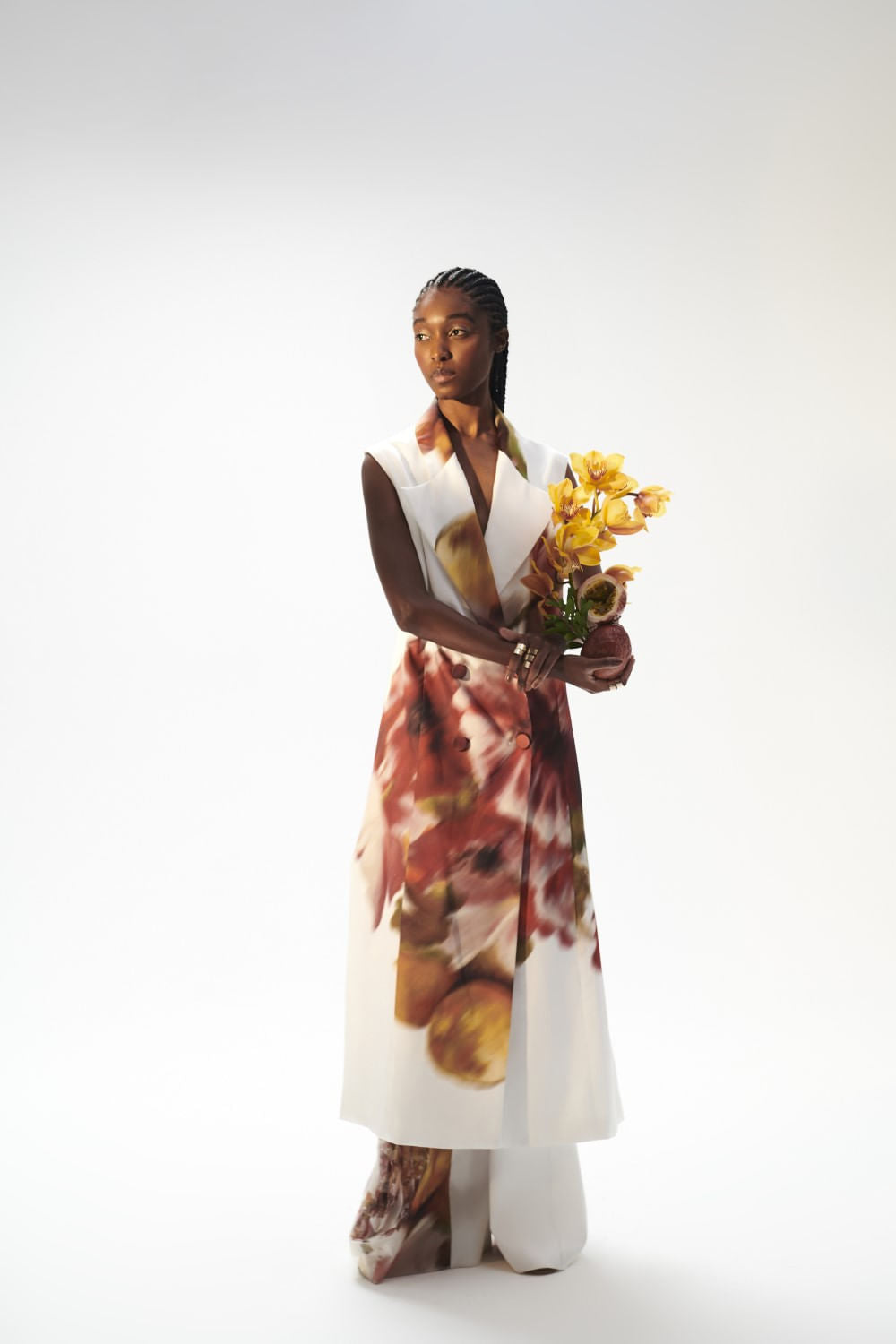 Colete estampado confeccionado em mikado, possui quatro botões no centro frente, pala dupla, recorte vazado na parte posterior e forro interno. O broche não acompanha a peça.