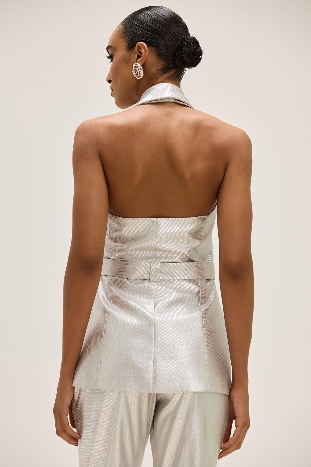 Confeccionado em tecido metalizado, este colete combina estrutura e brilho sutil em uma proposta contemporânea. O fechamento com zíper de metal reforça o caráter moderno da peça, enquanto a faixa para amarração na cintura permite ajustar o caimento e valorizar a silhueta.