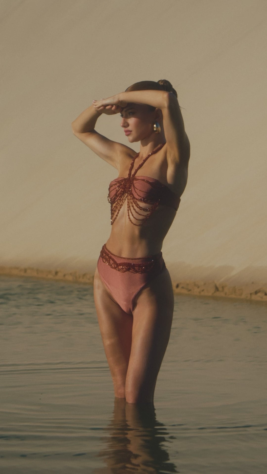 Inspirada nos corais dos jardin subaquáticos a hot pants em lycra, possui bordado orgânico de cristais e vidrilhos no cós, com franjas de pedraria, para um look de praia especial e glamouroso.