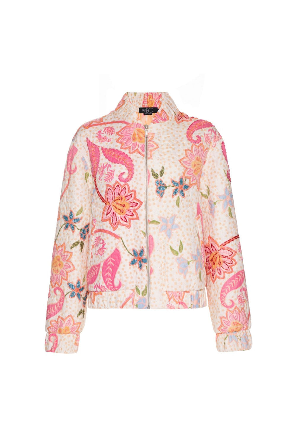 Jaqueta estampada e bordada com elástico embutido na gola, punhos e barra, dois bolsos frontais e zíper destacável no centro frente.
