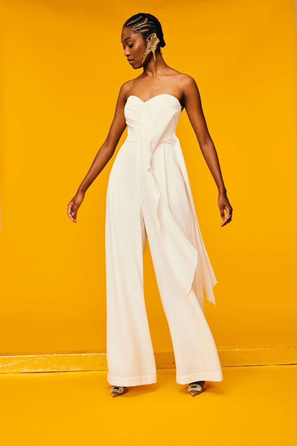 Macacão com babado sobreposto, faixa embutida para amarração, bolsos nas laterais, zíper invisível no centro ccostas e forro interno.