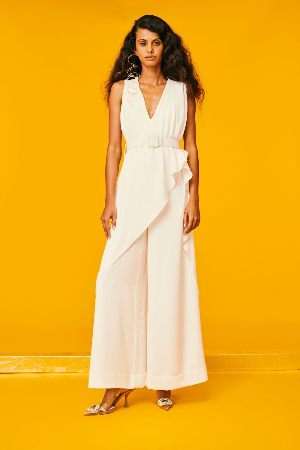 Macacão com babado sobreposto, acompanha cinto, passante na cintura, decote "v", zíper invisível no centro costas e forro interno.