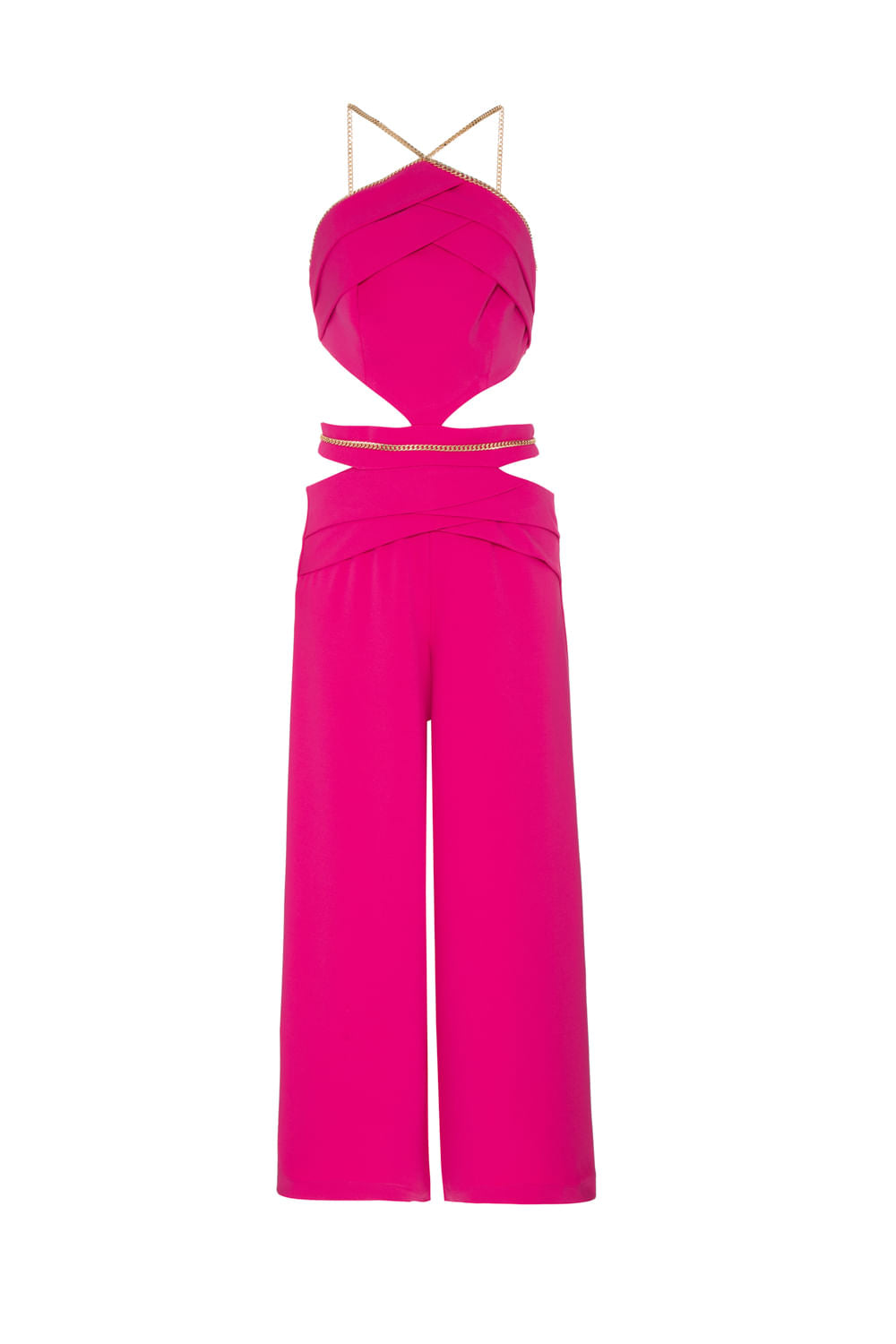 Macacão frente única, recorte vazado das costas até as laterais, palas cruzadas e sobrepostas, alças reguláveis, detalhes em correntes, três botões encapados e zíper invisível na parte posterior da peça e forro interno.