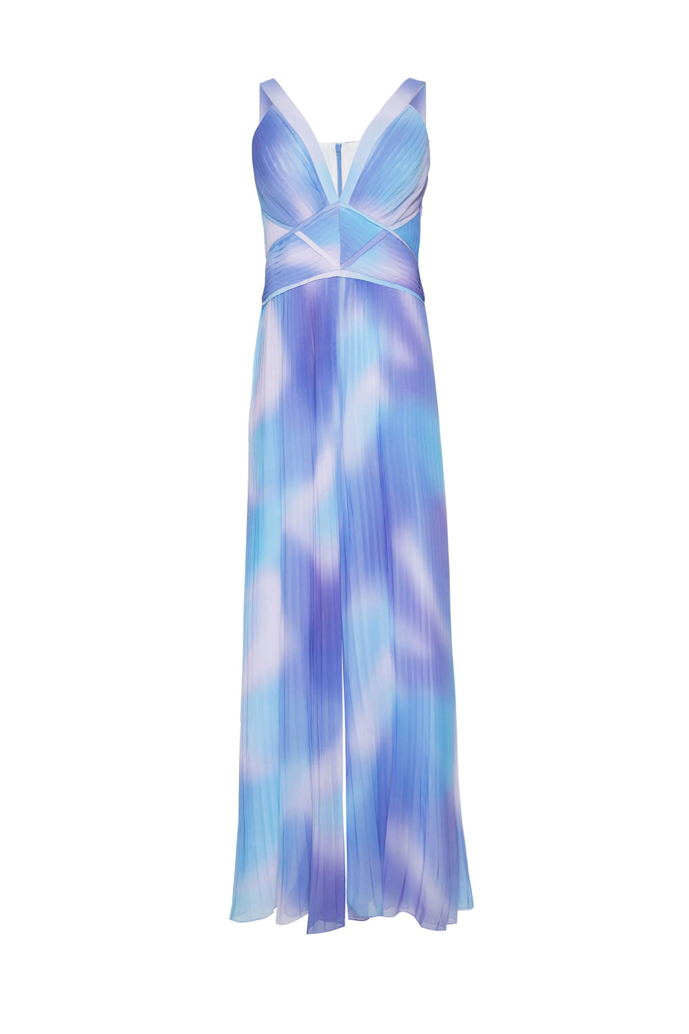 Macacão estampado com recortes, plissado, alças largas e fixas, pala do decote duplo, zíper invisível no centro costas e forro interno.