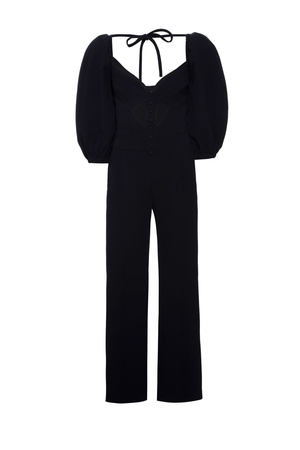 Macacão liso com mangas bufantes, elástico embutido nos ombros e nos punhos, recortes vazados e oito botões forrados no centro frente, ombreiras, dois cordões para amarração nas costas, zíper invisível para fechamento e forro interno parcial.
