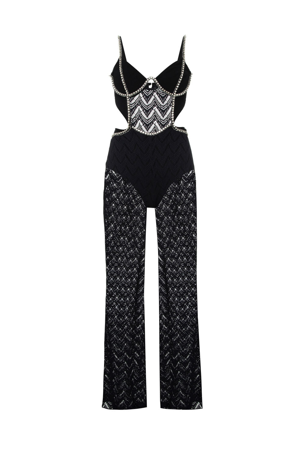 Desenvolvido em Collab com a modelo Alessandra Ambrósio, esse Macacão possui calça e recorte em tela, busto estruturado com aplicação de strass e forro no body.