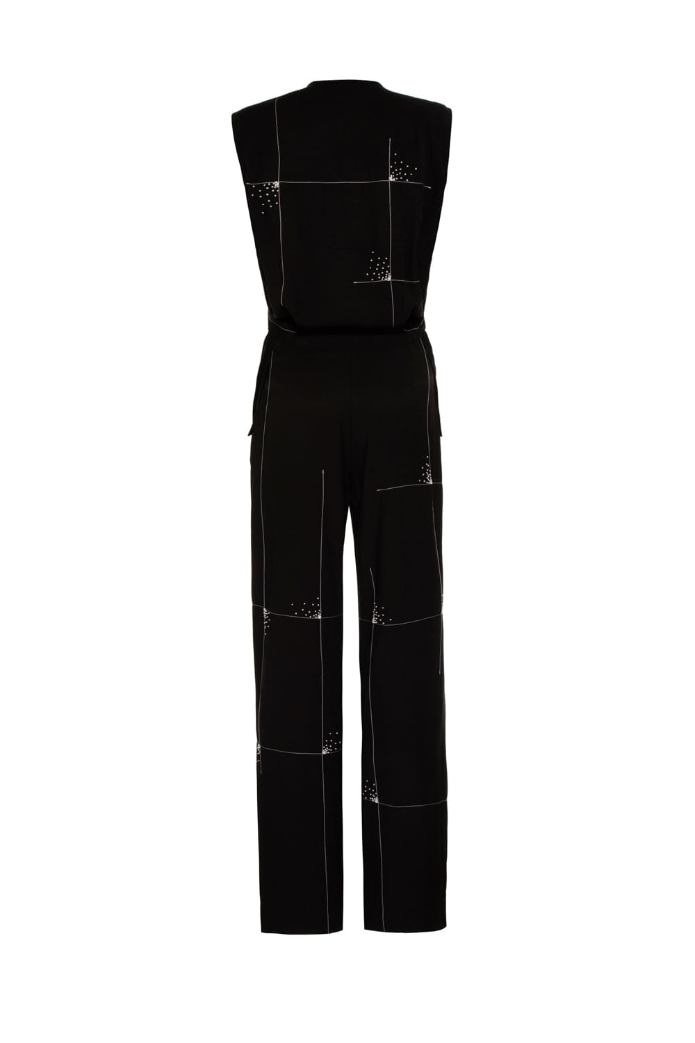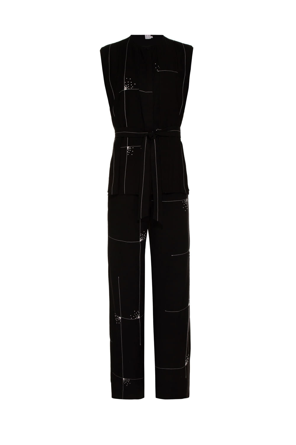 Macacão longo com frente e costas sobrepostas, faixa para amarração na cintura, bordado assimétrico e pregas na parte de cima.