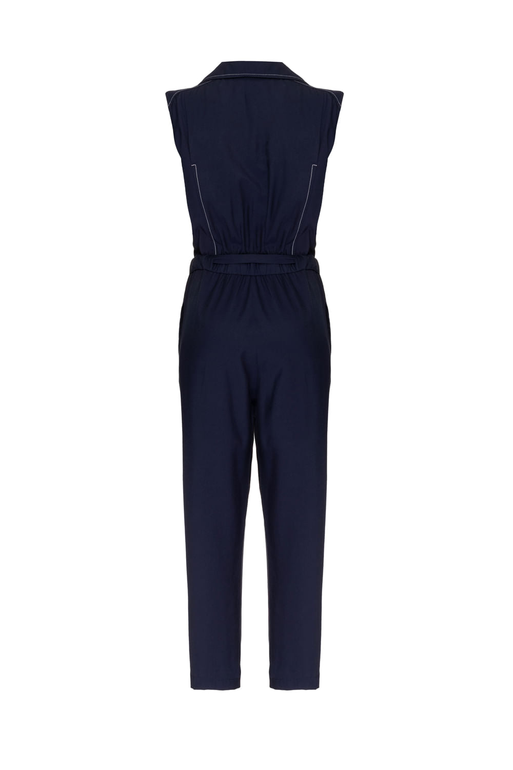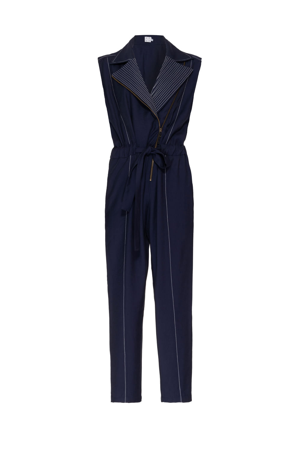 Macacão sem mangas com detalhes em pespontos, canaleta e faixa para amarração na cintura, gola dupla estruturada e zíper fixo no fechamento.