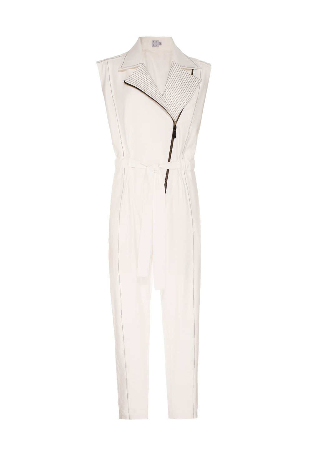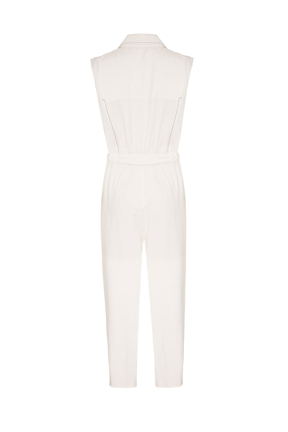 Macacão sem mangas com detalhes em pespontos, canaleta e faixa para amarração na cintura, gola dupla estruturada e zíper fixo no fechamento.