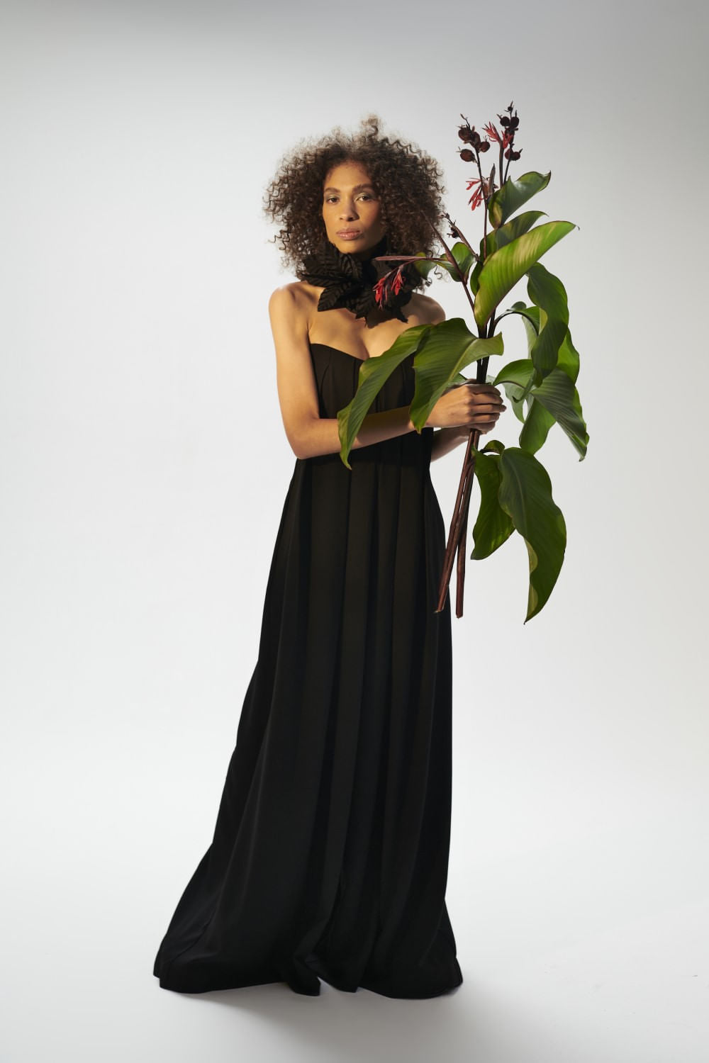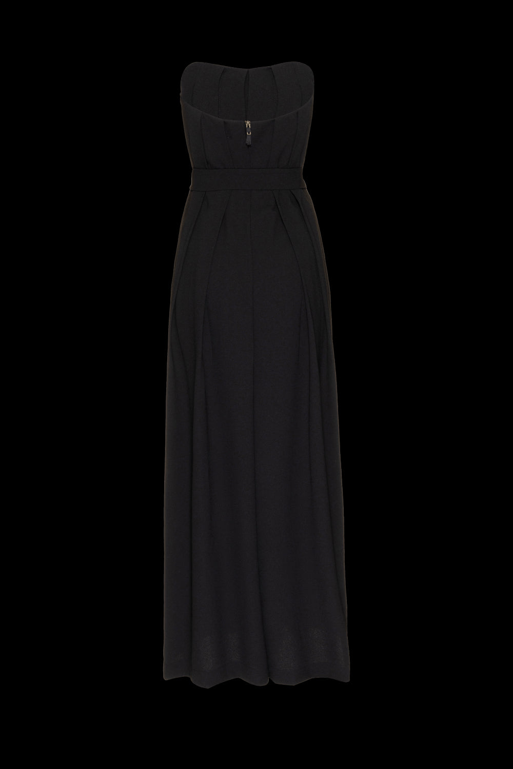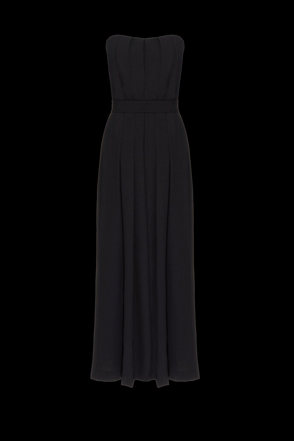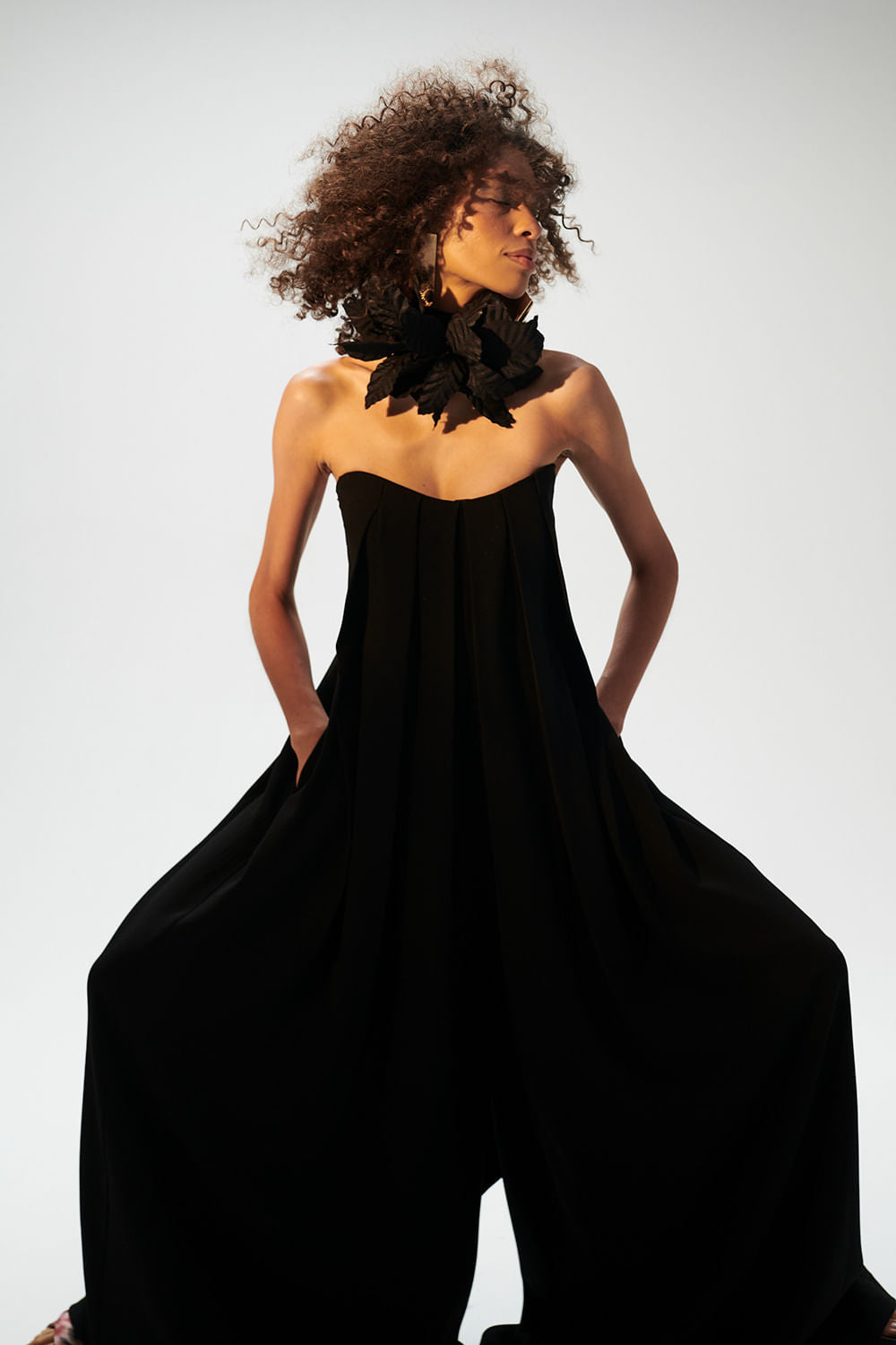 Macacão sem mangas/ alças confeccionado em crepe, possui pregas no busto, barra ampla, dois bolsos laterais, zíper no centro costas e forro interno.