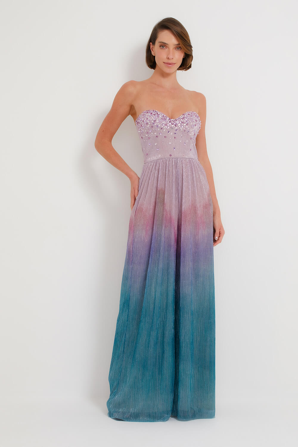 Macacão confeccionado em lurex, possui bojo fixo, hastes para sustentação, bordado aplicado, zíper invisível no centro costas e forro interno.