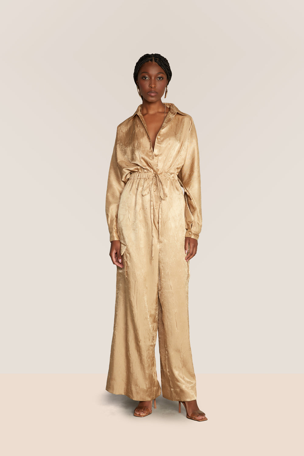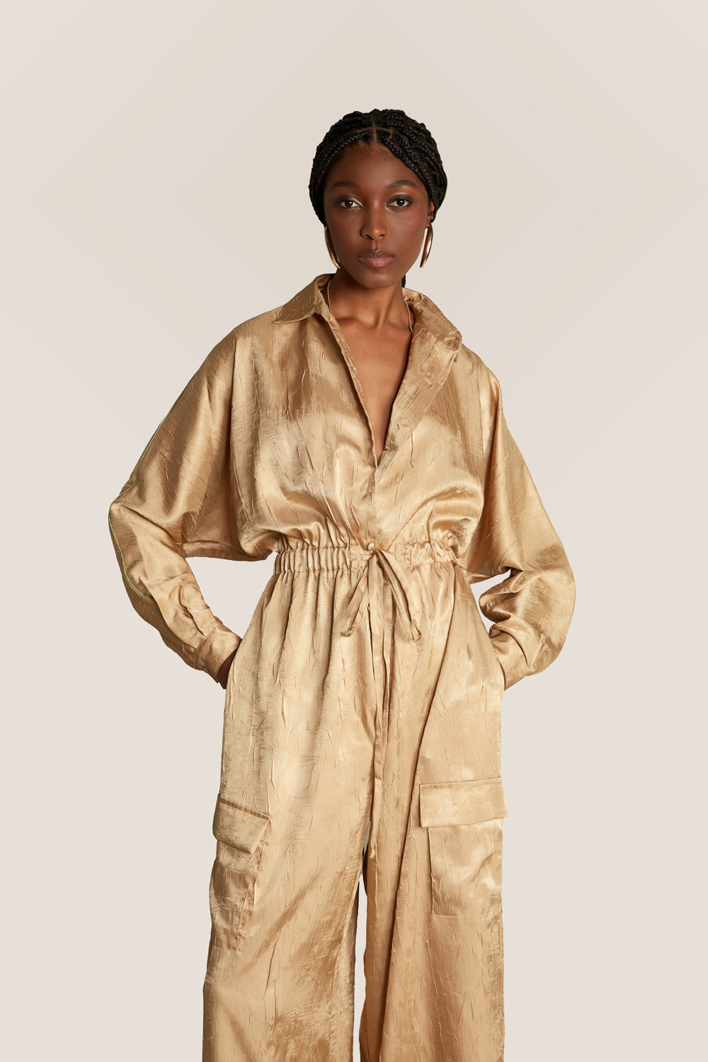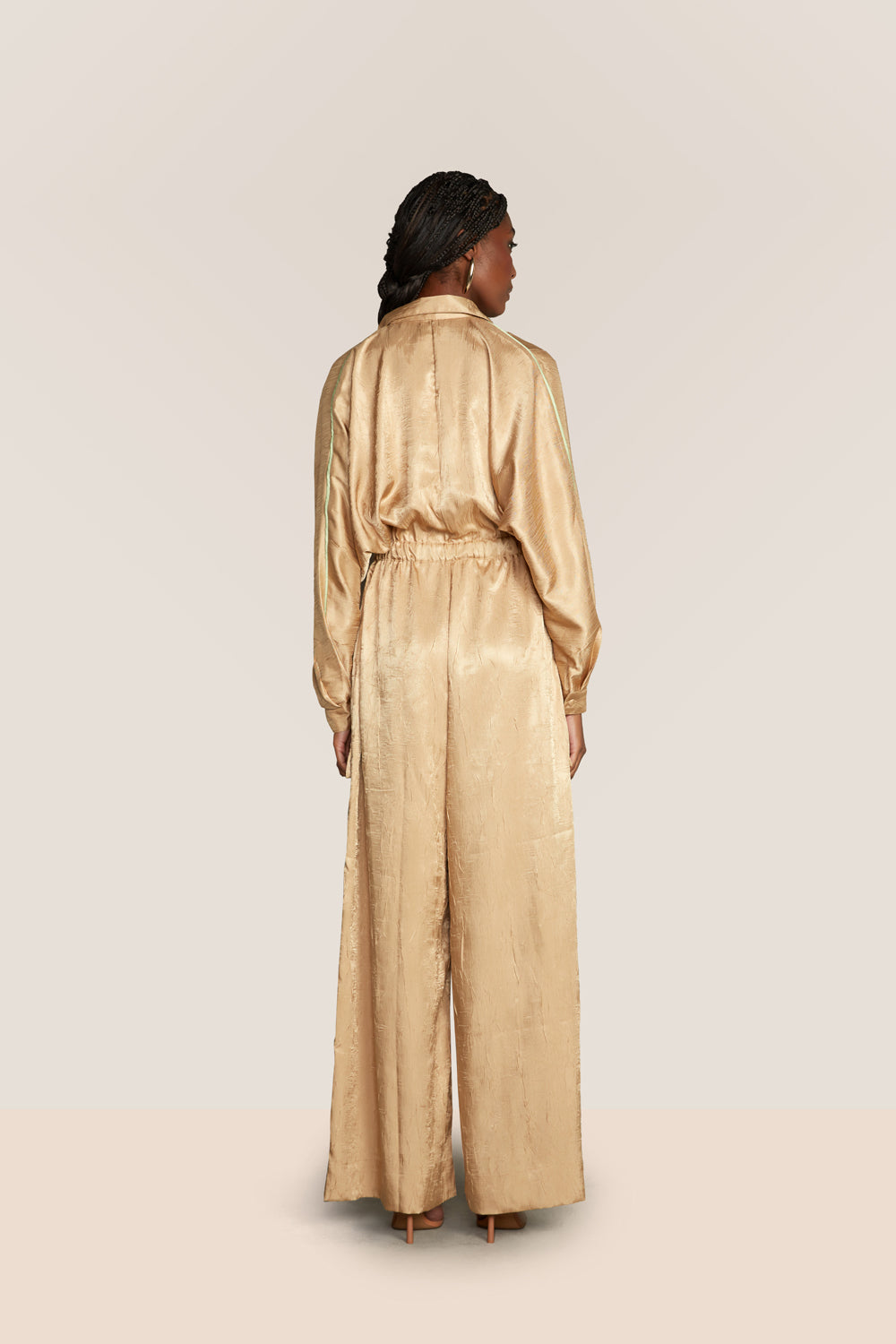 Confeccionado em cetim texturizado, este macacão destaca-se pelas mangas morcego com acabamento em viés, que acrescentam movimento e sofisticação ao visual. A calça ampla conta com bolsos laterais também realçados por viés, reforçando o design contemporâneo. O elástico na cintura proporciona conforto e melhor ajuste ao corpo, enquanto o zíper comum e os botões cobertos garantem um fechamento funcional com acabamento elegante.