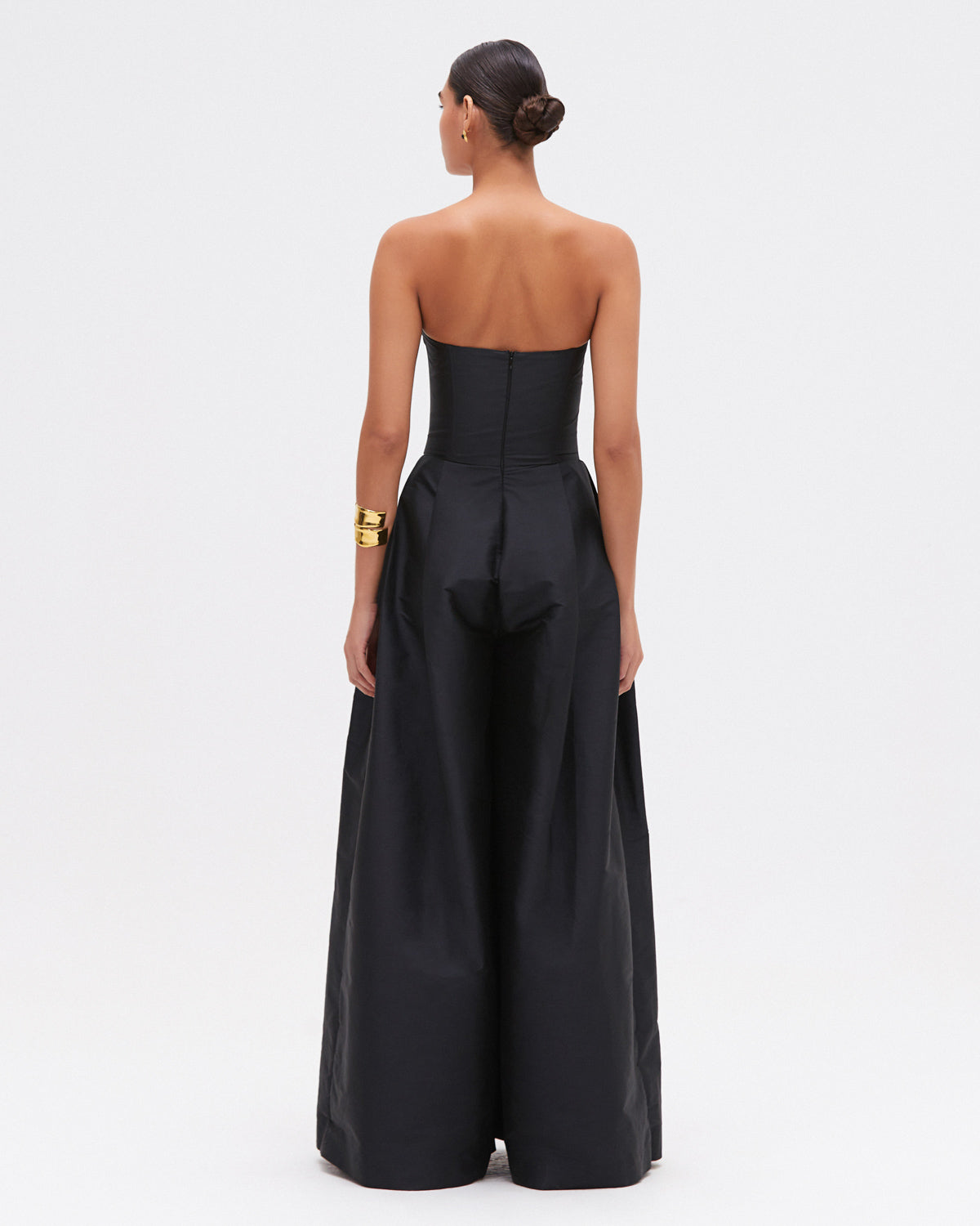 O macacão Tafeta Bloom sem alças, é confeccionado em tafetá estruturado, com decote arredondado em coração e aplicação de uma flor branca marcante no busto. As calças de pernas largas criam movimento dramático e alongam a silhueta, enquanto detalhes sob medida, como bolsos laterais e zíper invisível, conferem acabamento refinado. Uma peça que combina presença, elegância e feminilidade em cada detalhe.