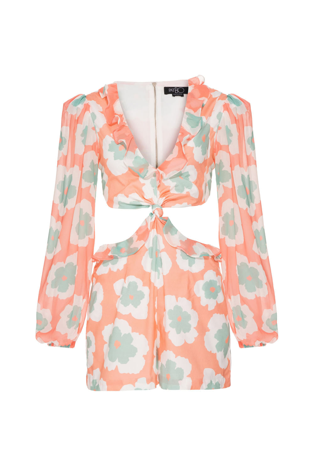 Macaquinho estampado com mangas longas, ombreiras, aplicação de babado no decote e na abertura abaixo do busto, torcido no centro frente, elástico embutido nos punhos, dois bolsos nas laterais do quadril, zíper destacável e zíper invisível na parte posterior da peça e forro interno parcial.