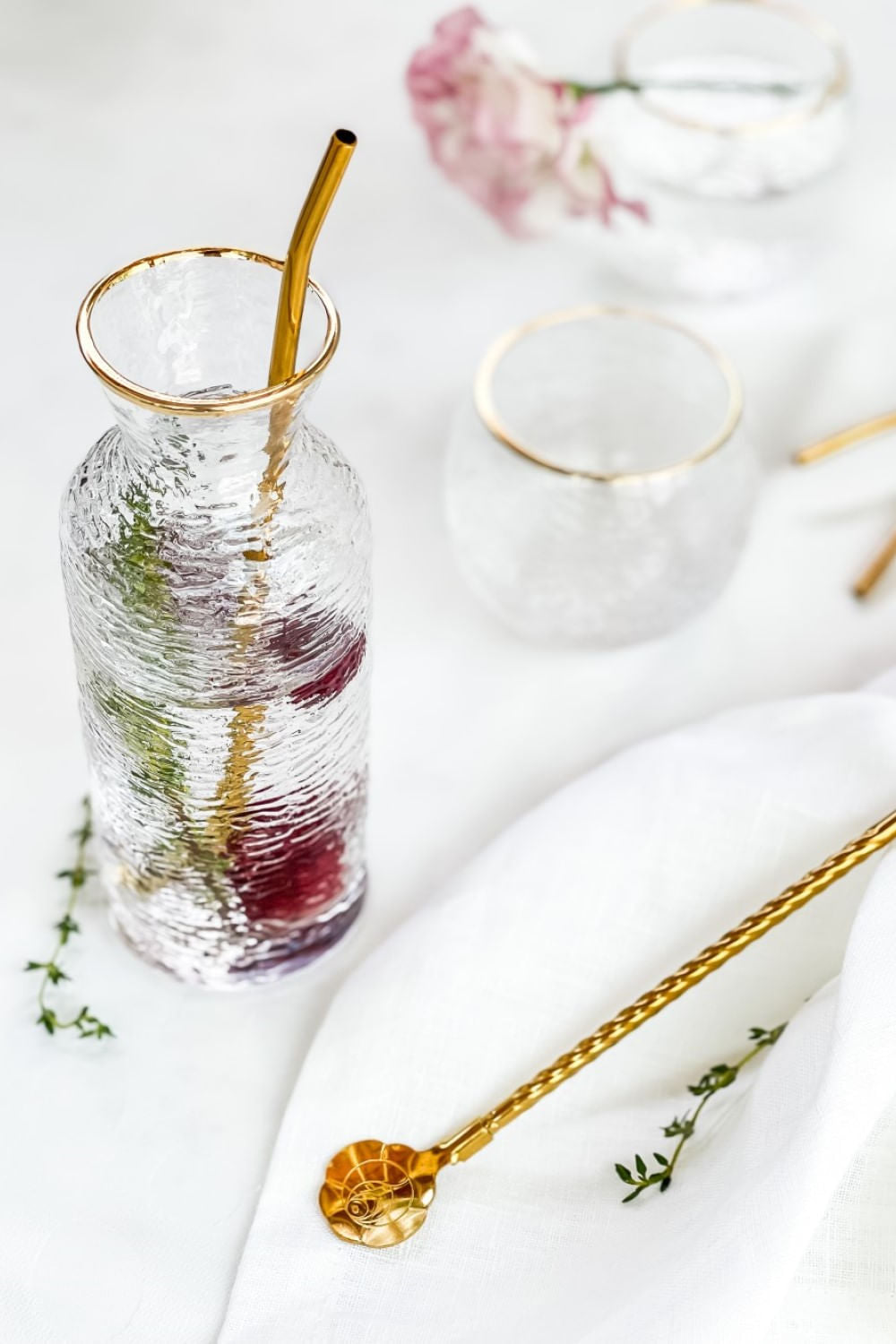 Mini jarra em vidro texturizado com borda pintada na cor dourada. Vidro resistente à altas temperaturas.