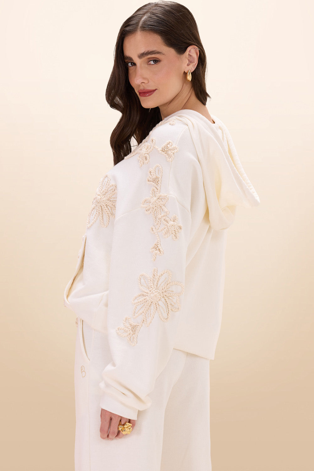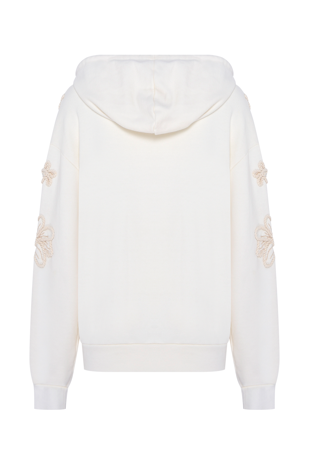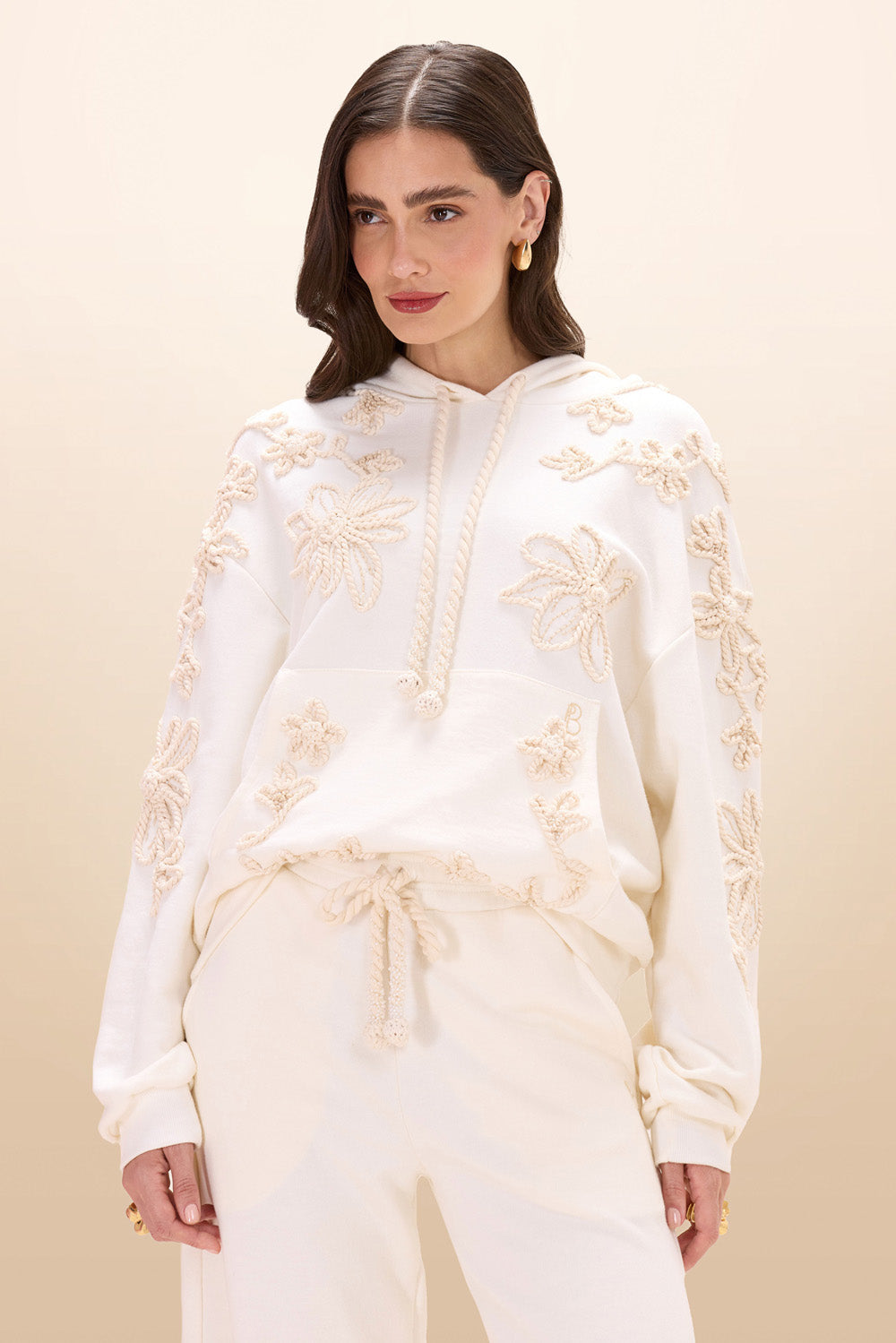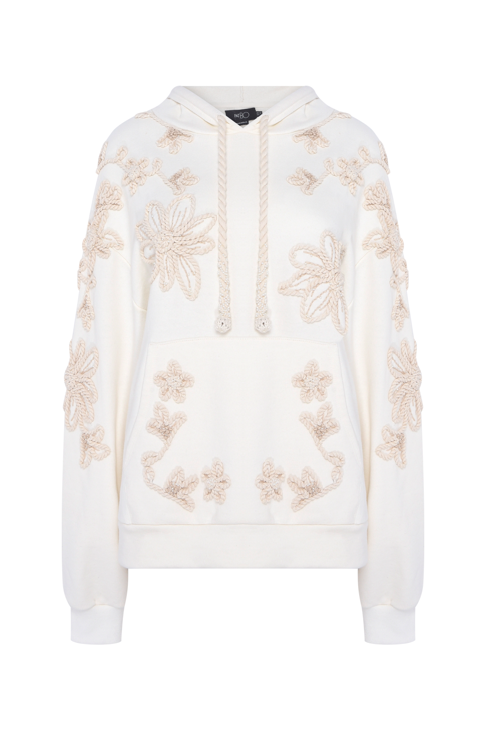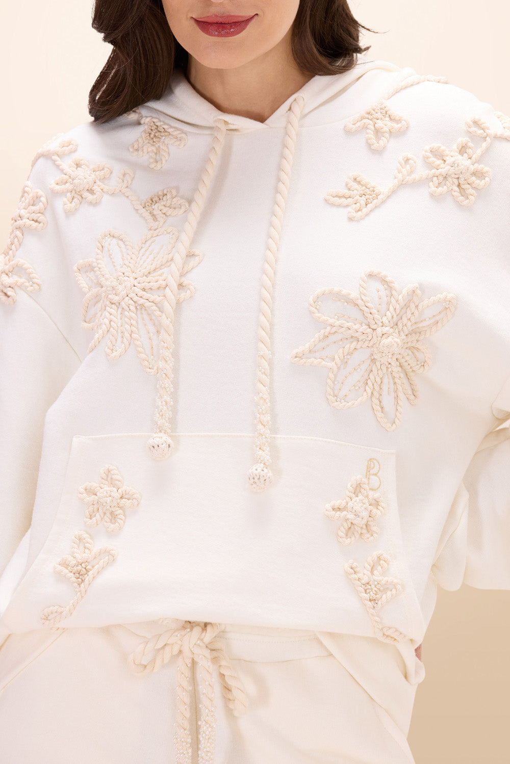Moletom de algodão, com bolso frontal, punho e cós em ribana, com capuz e cordão trançado com ponteira de crochet. Moletom todo bordado com cordão trançado formando desenhos de flores, galhos e flores, manualmente, com detalhes em linhas que dão mais texturas e mini pérolas trazendo brilho sutil. Peça que equilibra conforto com feminilidade e ousadia.