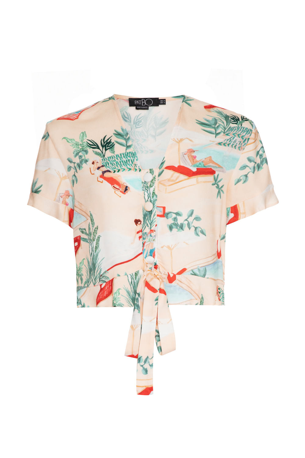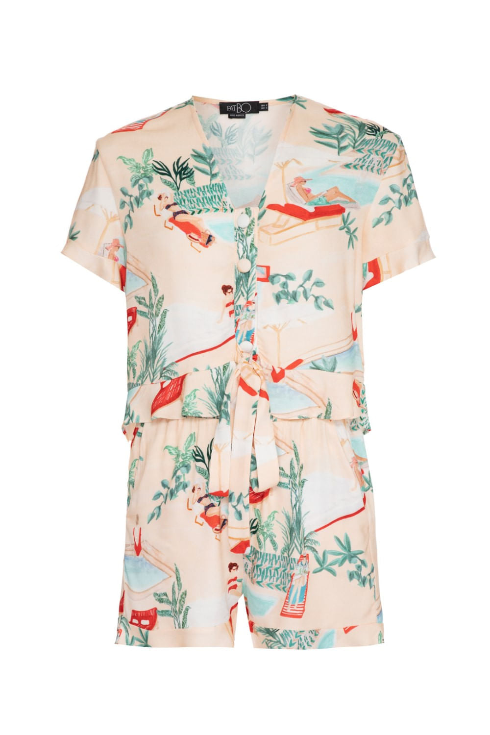 Pijama curto estampado com quatro botões encapados no centro frente, babado nas cavas do short e nas mangas e short com elástico embutido no cós.