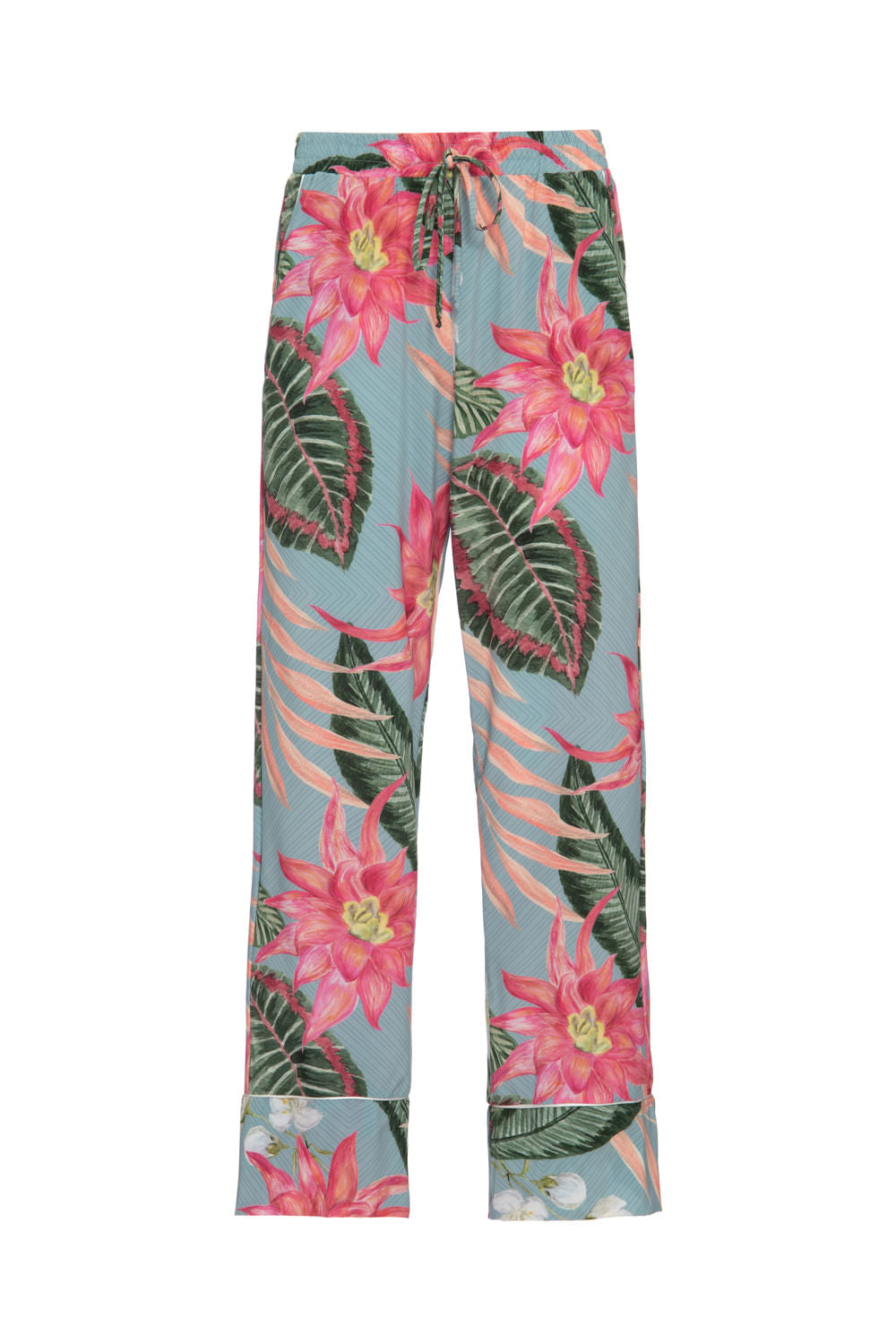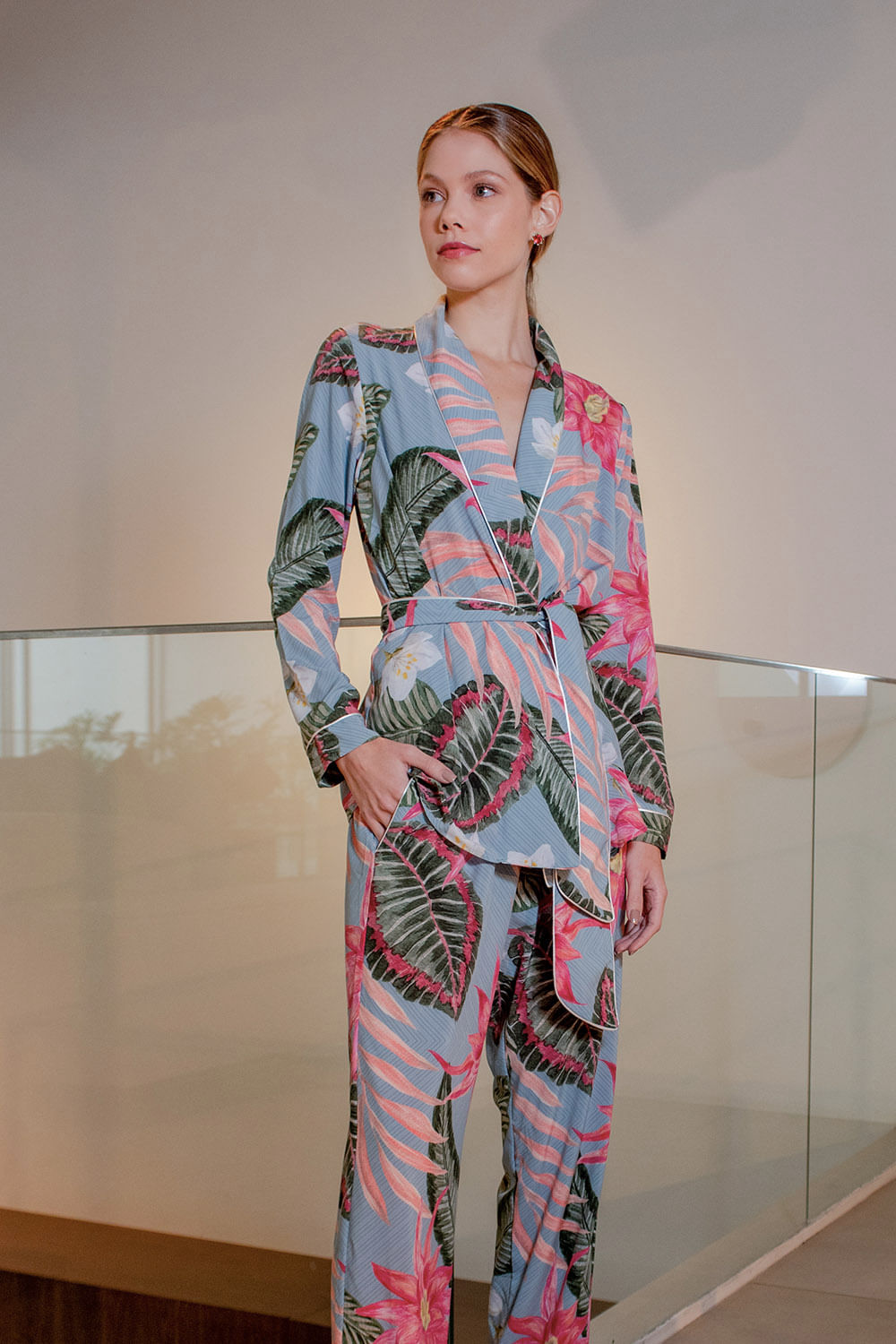 Pijama longo com blusa tipo kimono, gola dupla e faixa para amarração na cintura. Calça com elástico embutido e cordão para amarração no cós, bolsos laterais e acabamento em vivo liso nas duas peças. Tapa olho e scrunchie acompanham o pijama.