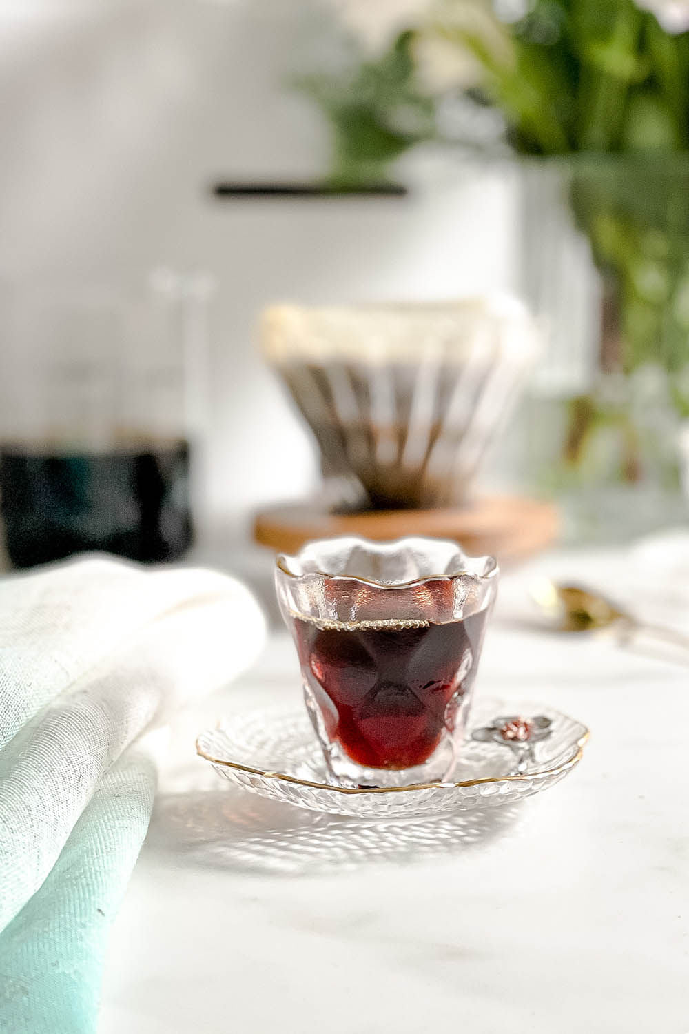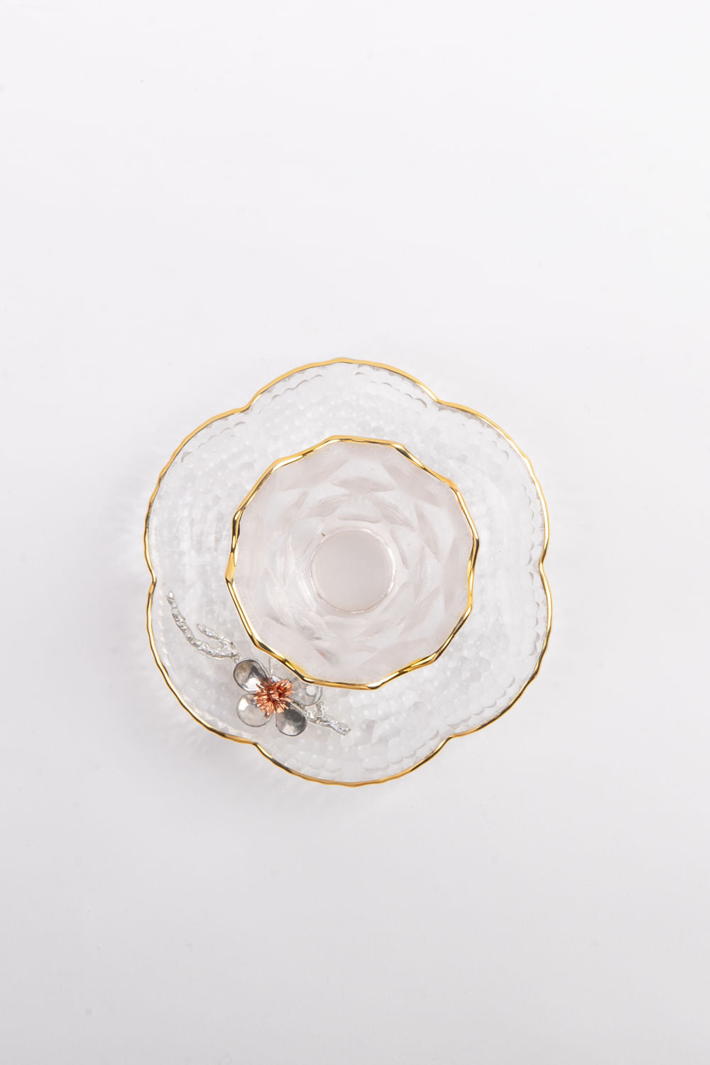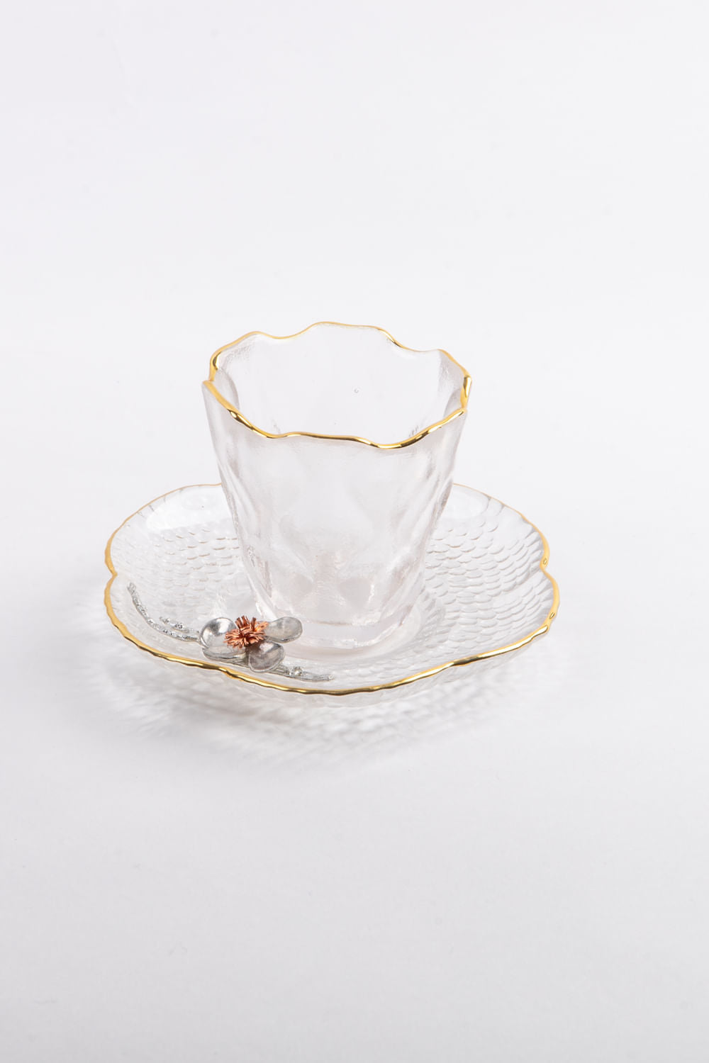 Pires em vidro texturizado com detalhe em aço maleável e borda pintada na cor dourado. Vidro resistente à altas temperaturas. Não acompanha xícara.
