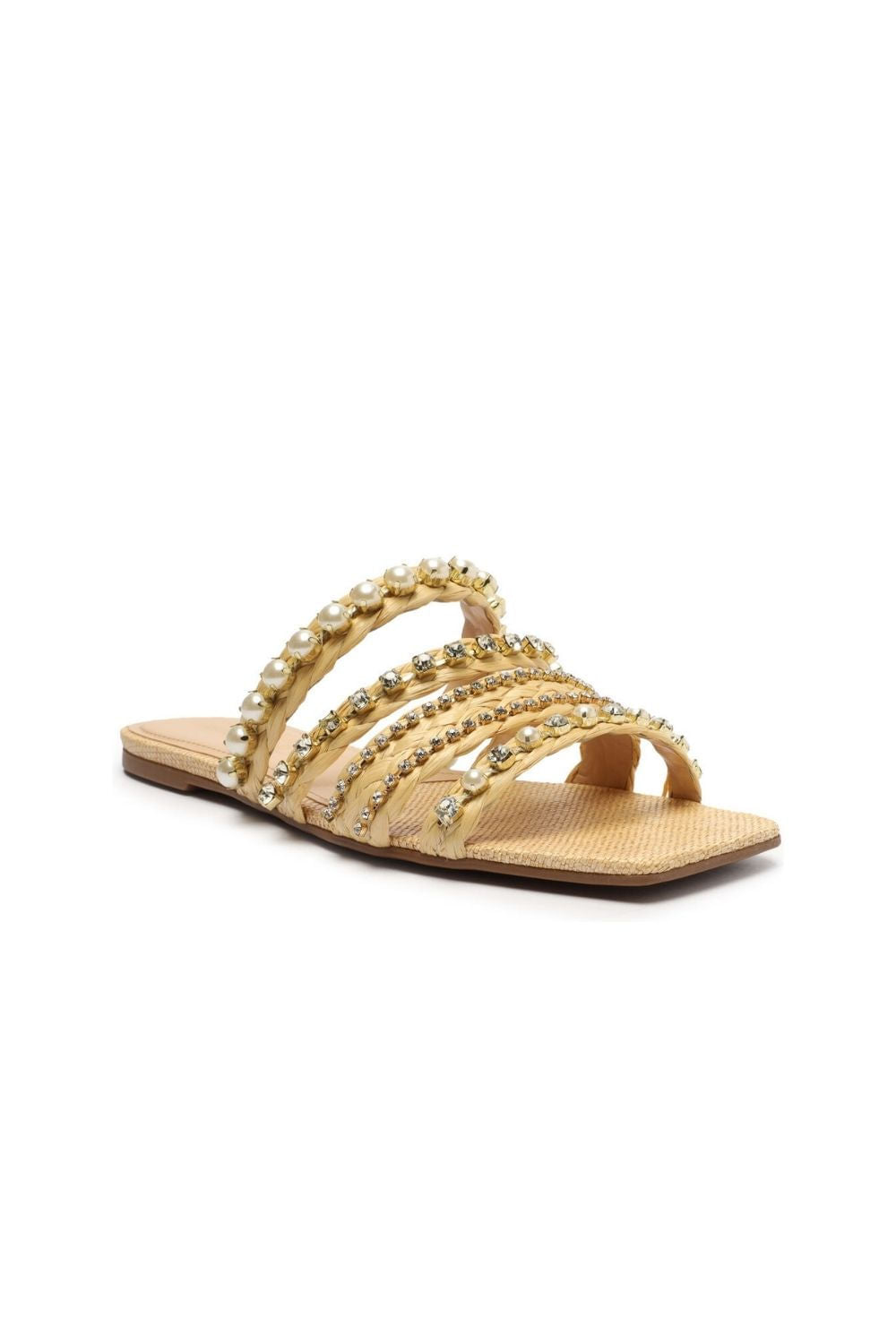 Desenvolvida em collab com a marca AREZZO, essa sandália possui revestimento em palha, tiras trançadas com pedrarias no cabedal, bico quadrado e palmilha com gravação Arezzo + PatBO.